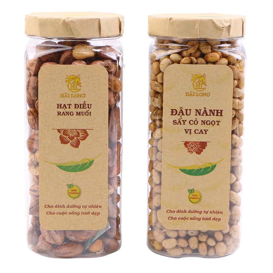 Hộp Quà Hải Long 15A bao gồm Điều rang muối vỏ lụa (230g) và Mứt gừng nướng mật ong (120g), là sự kết hợp giữa vị béo bùi, mặn mặn của hạt điều rang và