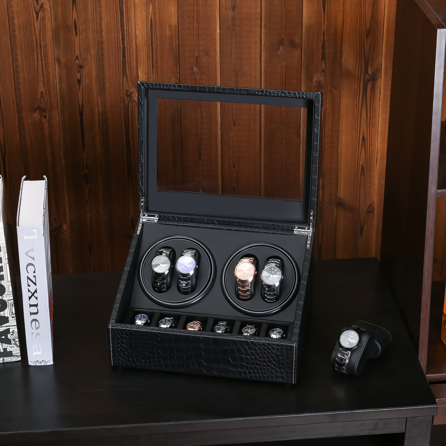 ✨Hộp Xoay Đồng Hồ Cơ SAIKE SAIKE S4602 Mẫu 4 Xoay 6 Tĩnh Vỏ Da Cá Sấu Màu Đen Sang Trọng