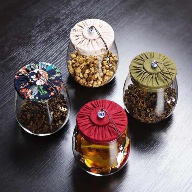 Lọ thuỷ tinh nắp vải đẹp mắt dùng để đựng trà khô, hoa trà, các loại hạạch sẽ, dễ đóng mở. Ngoài ra, để trưng bày cũng rất đẹp mắt.