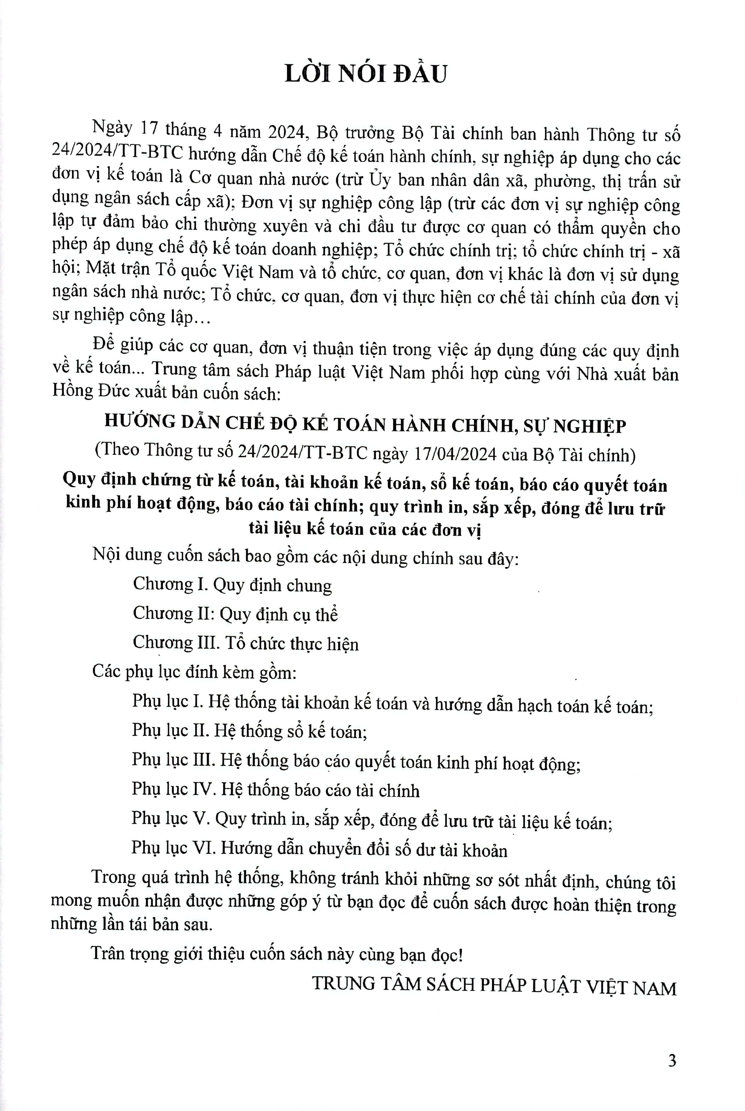 Ngày 17 tháng 4 năm 2024, Bộ Tài chính ban hành Thông tư số 24/2024/TT-BTC hướng dẫn Chế độ kế toán hành chính, sự nghiệp gồm: chứng từ kế toán, tài khoản kế toán, sổ kế toán, báo cáo quyết toán kinh phí hoạt động, báo cáo tài chính; quy trình in, sắp xếp, đóng để lưu trữ tài liệu kế toán của các đơn vị. Đối tượng được áp dụng cho các đơn vị kế toán, bao gồm: Cơ quan nhà nước (trừ Ủy ban nhân dân xã, phường, thị trấn sử dụng ngân sách cấp xã); Đơn vị sự nghiệp công lập; Tổ chức chính trị; tổ chức chính trị – xã hội; Mặt trận Tổ quốc Việt Nam và tổ chức, cơ quan, đơn vị khác là đơn vị sử dụng ngân sách nhà nước; Tổ chức, cơ quan, đơn vị thực hiện cơ chế tài chính của đơn vị sự nghiệp công lập.