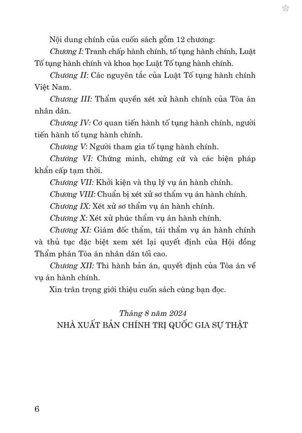 Mua tại TiktokNhằm hỗ trợ cho sinh viên, học viên các cơ sở đào tạo học tập, tìm hiểu, nghiên cứu các nội dung của môn học Luật Tố tụng hành chính Việt Nam một cách căn bản, có hệ thống, Nhà xuất bản Chính trị quốc gia Sự thật xuất bản cuốn sách Hướng dẫn môn học Luật Tố tụng hành chính Việt Nam do GS.TS Phạm Hồng Thái làm Chủ biên.