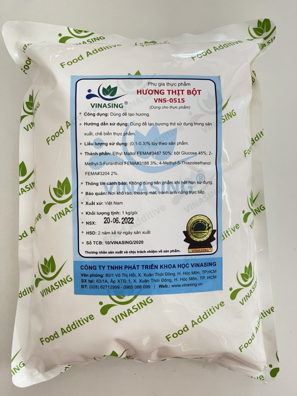 Hương Thịt VS - 0515(B) - Hướng dẫn Sử dụng: Dùng tạo hương thịt sử dụng trong sản xuất chế biến thực phẩm. - Liều lượng sử dụng: 0,1%-0,3% tùy theo sản phẩm. - Thành phần: Chất tạo tổng hợp: Ethyl maitol (FEMA 3487) (50%), bột Glucose (45%), chất tạo hương tổng hợp: 2-Methyl-3-Furanthiol (FEMA 3188) (3%),4-methyl-5-thiazoleethanol (FEMA 3204) (2%). - Cam kết đơn hương đã được JECFA đánh giá và xác - định an toàn. - Số TCB: 10/VINASING/2020. - Khối lượng: 1Kg. - Hướng dẫn bảo quản: Nơi khô ráo, thoáng mát, tránh ánh nắng trực tiếp -