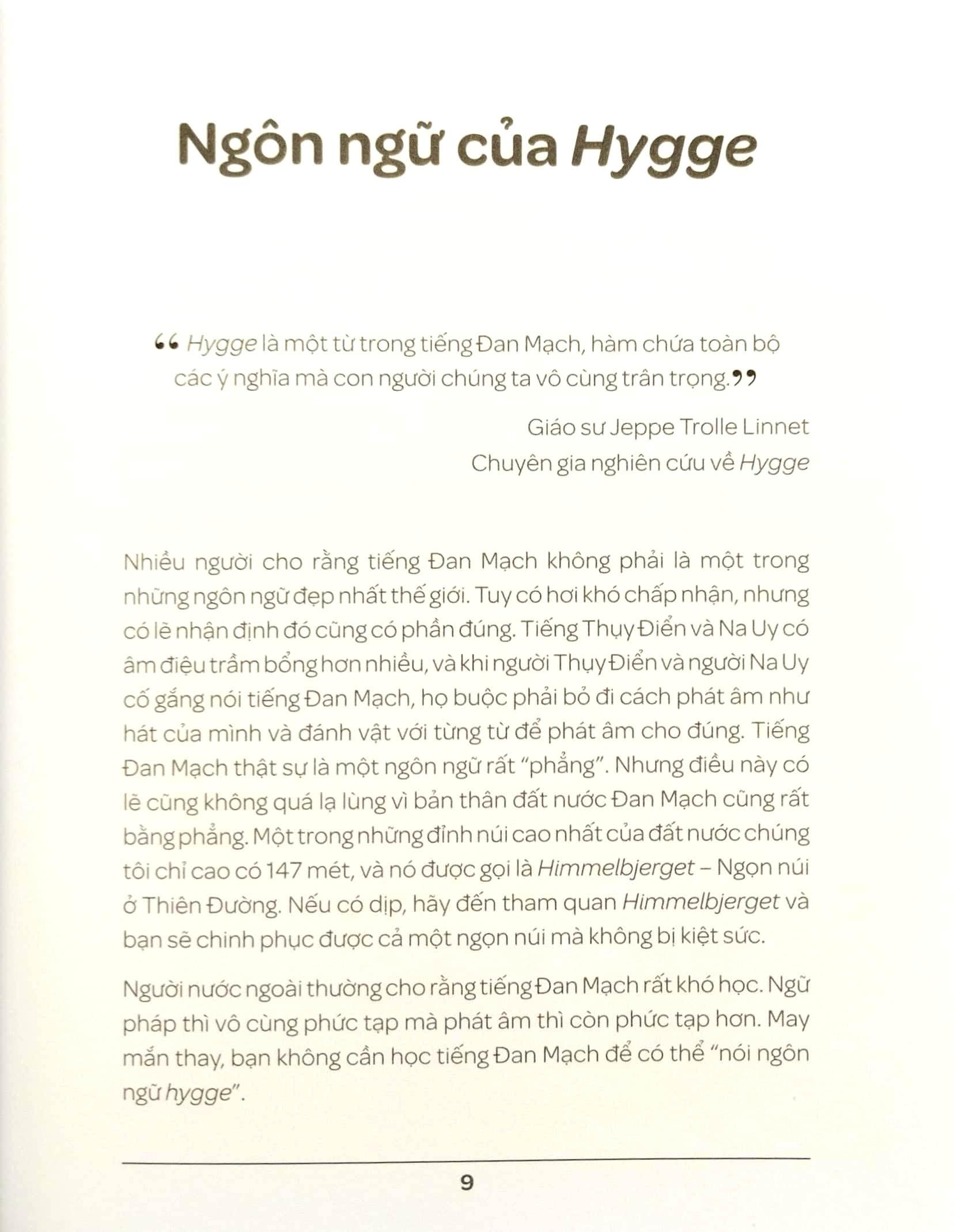 Chẳng có định nghĩa chung, thống nhất nhưng sau toàn bộ nội dung tác phẩm, người đọc sẽ cảm nhận được tinh thần của Hygge và tự chọn được cách Hygge cho mình. Như lời của Anne Glad, chuyên gia hàng đầu thế giới về lối sống, có thể hygge không phải là đáp án cho mọi câu hỏi lớn trong cuộc sống, nhưng chắc chắn hygge là một lời mời gọi chúng ta suy nghĩ về cuộc sống và hạnh phúc dưới một góc nhìn rộng hơn. Điều gì là quan trọng đối với chúng ta? Chúng ta cần làm việc nhiều đến mức nào? Và chúng ta cần gì để hạnh phúc? Hygge là lời mời gọi tận hưởng những thứ nhỏ bé trong cuộc sống, bởi vì thật ra đó chính là những điều to lớn.