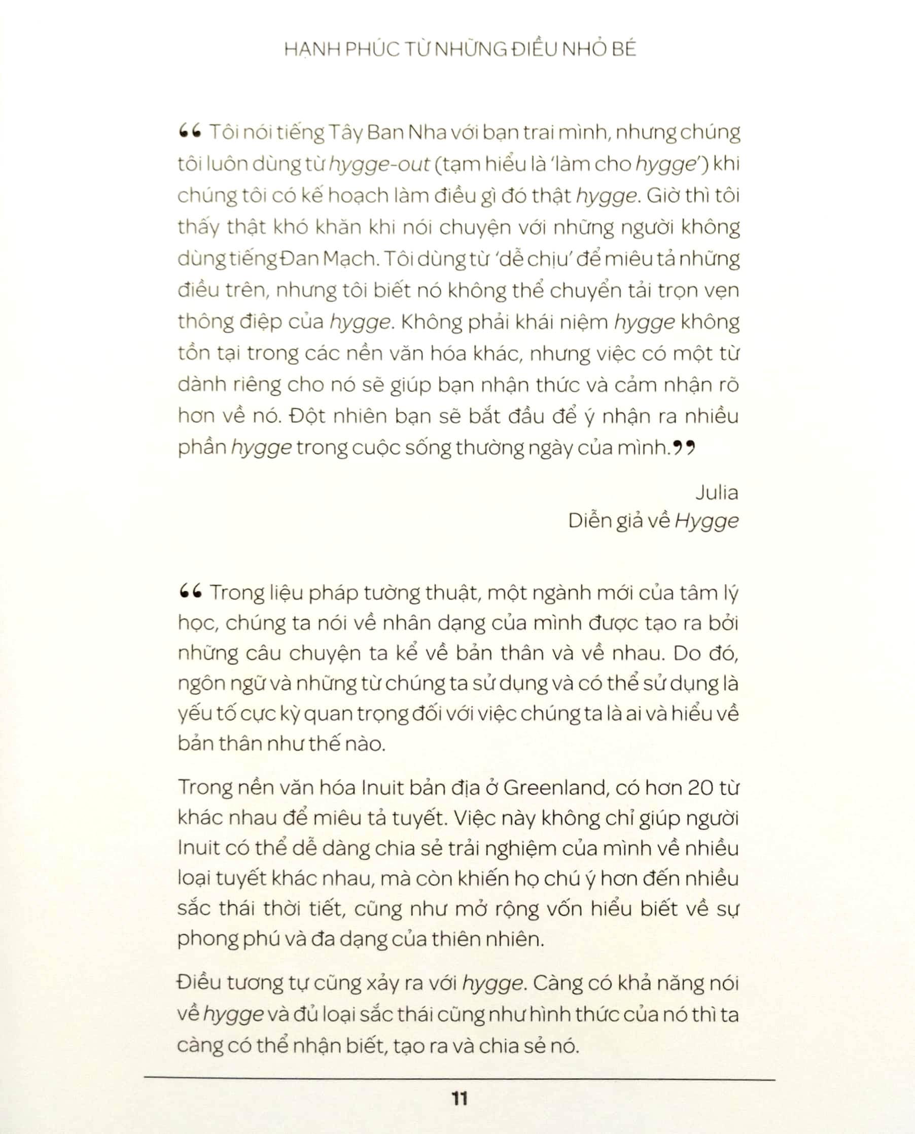 Xác định cuốn sách sẽ là một tài liệu hướng dẫn thực hành, Hạnh phúc từ những điều nhỏ bé được tác giả chắt lọc, đầu tư từ câu chữ đến hình ảnh. Marie đưa người đọc vào từng ngôi nhà, từng gian bếp, từng góc phòng… để chứng kiến nhịp sinh hoạt đặc biệt của những con người nơi đây. Marie đã đành không ít thời gian để gặp gỡ, trao đổi với rất nhiều thành phần trong xã hội, từ các chuyên gia nghiên cứu về Hygge, diễn giả, nhà tâm lý… để lắng nghe những định nghĩa của họ về Hygge cũng như cách họ thiết lập tinh thần này vào chính cuộc sống thường nhật. Độc giả sẽ được xuôi theo dòng lịch sử, địa lý, con người… Đan Mạch để hiểu vì sao khái niệm Hygge được khởi phát và để thấy được tác dụng của nó thế nào, cả trong quá khứ lẫn hiện tại với quốc gia này. Không dừng lại ở những khái niệm, tác giả cũng đưa ra cụ thể cách thức triển khai, thực hành để làm thế nào đưa Hygge vào nhà, vào chính đời sống thường nhật để cuộc sống mỗi người có thể trở nên tốt đẹp hơn.