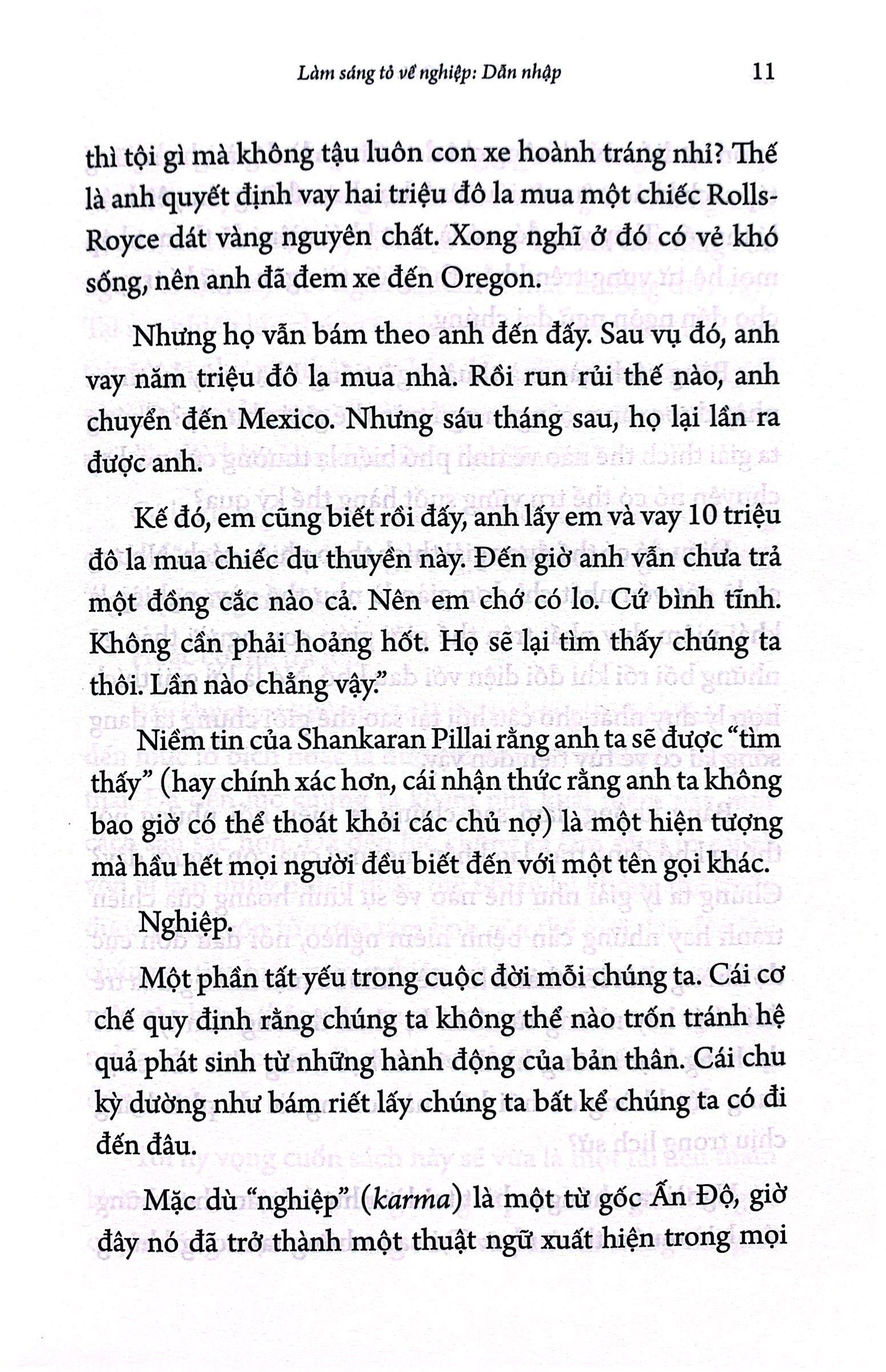 Hy vọng cuốn sách này sẽ vừa là một tài liệu tham khảo, vừa là một cẩm nang cung cấp cho độc giả những bí quyết sống một cách sáng suốt và yên vui trong thế giới nhiều thách thức này. Trong quá trình đó, cuốn sách cố gắng khôi phục lại tiềm năng chuyển hóa nguyên bản của từ “nghiệp”. Mong rằng cuốn sách sẽ tháo gỡ những hiểu lầm đang ngày càng lớn dần, đồng thời giúp bạn hiểu rõ toàn bộ sức mạnh ban sơ của nghiệp cũng như tác động cộng hưởng mãnh liệt của nó.