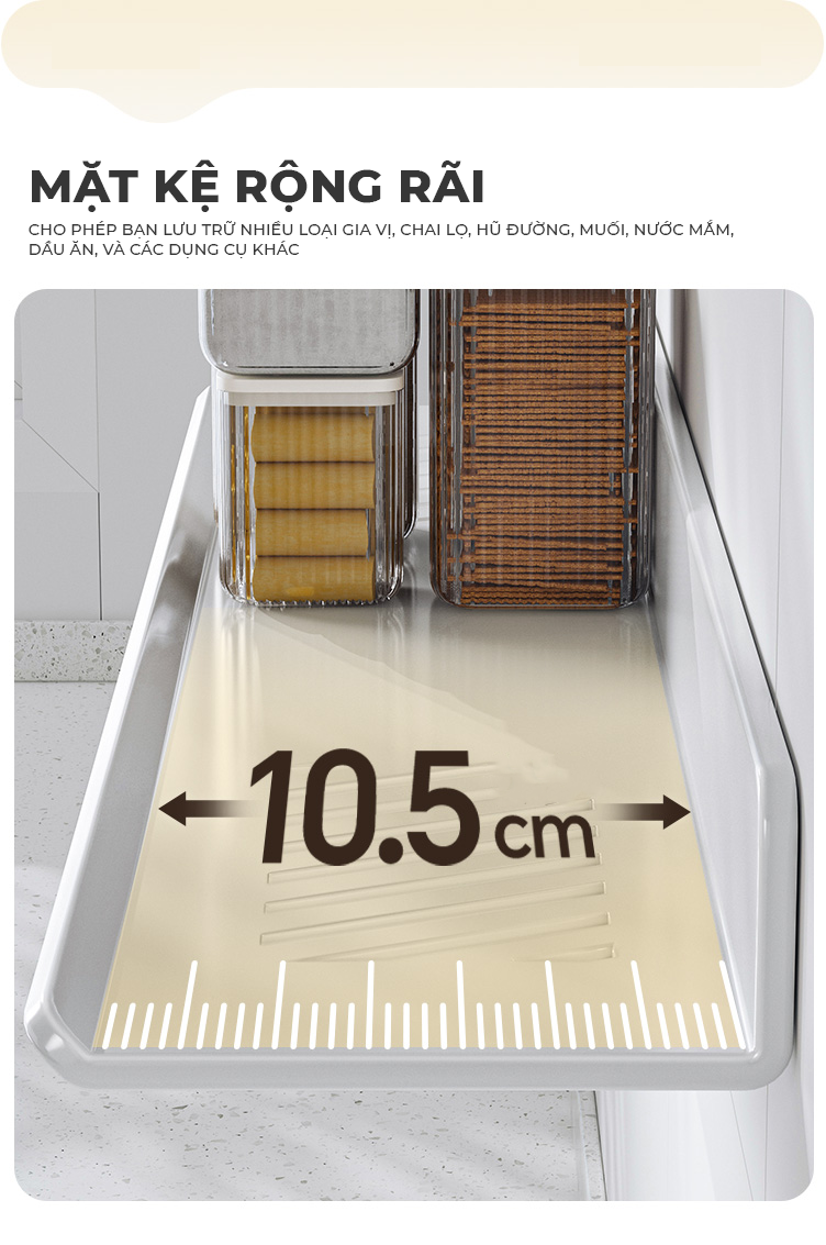 THÔNG TIN SẢN PHẨM - Tên sản phẩm: Kệ gia vị 3 tầng để bàn - Kích thước: Dài 40cm, Rộng 21cm, Cao 64cm. - Chất liệu: Khung thép sơn tĩnh điện chống ghỉ -