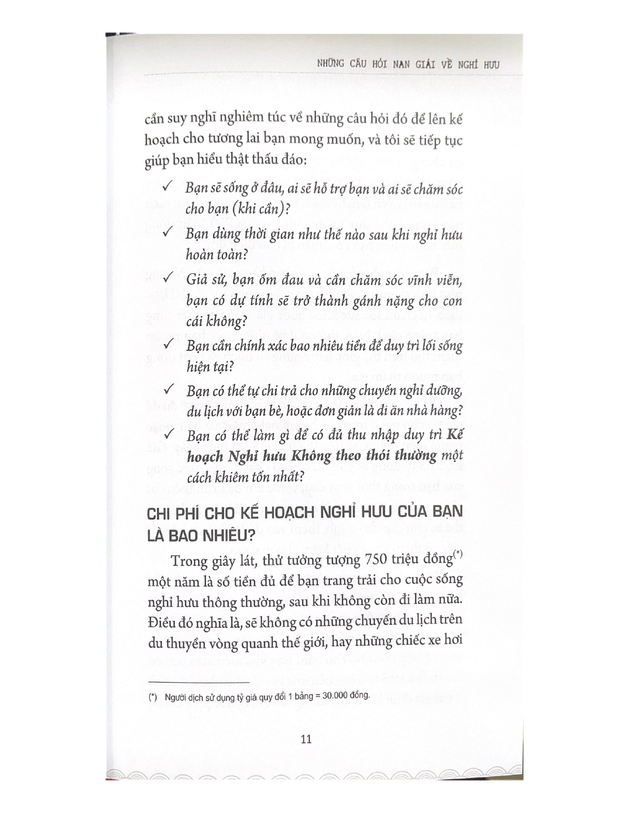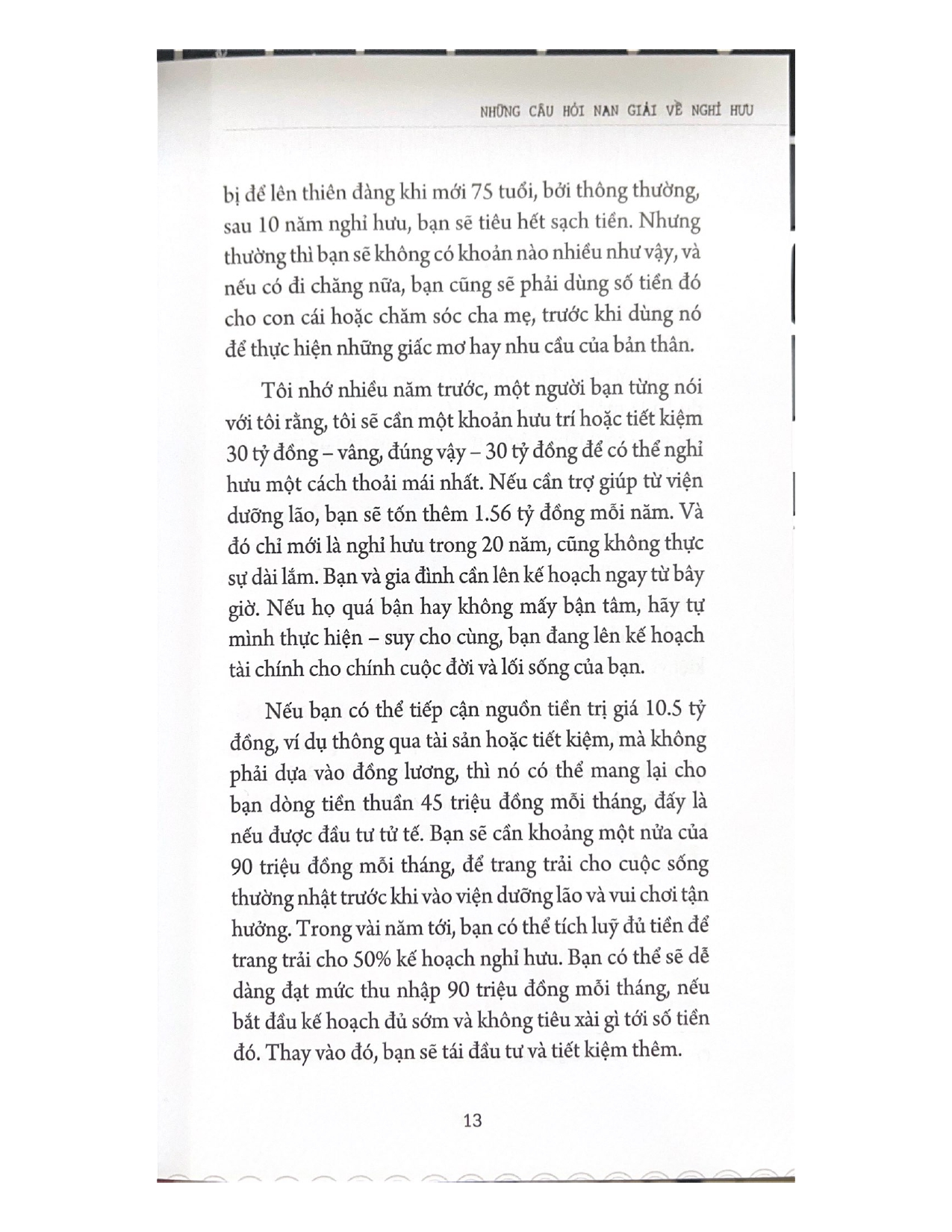 Tất cả chúng ta đều là những cá thể độc nhất và kế hoạch nghỉ hưu của ta cũng vậy. Ta cần phải nghiêm túc nhìn nhận xem tới lúc mình nghỉ hưu hoặc muốn nghỉ hưu thì còn bao lâu nữa. KẾ HOẠCH NGHỈ HƯU SUNG TÚC sẽ xây dựng cho bạn một quá trình tư duy, giúp bạn mường tượng và thậm chí có thể bắt đầu phác thảo chiến lược đầu tư tạo ra nguồn thu nhập và số vốn cần để bước tiếp. Những hiểu biết, nhận thức thu được sẽ giúp ta xác định được mức thu nhập đủ trang trải cho kế hoạch nghỉ hưu trong mơ.