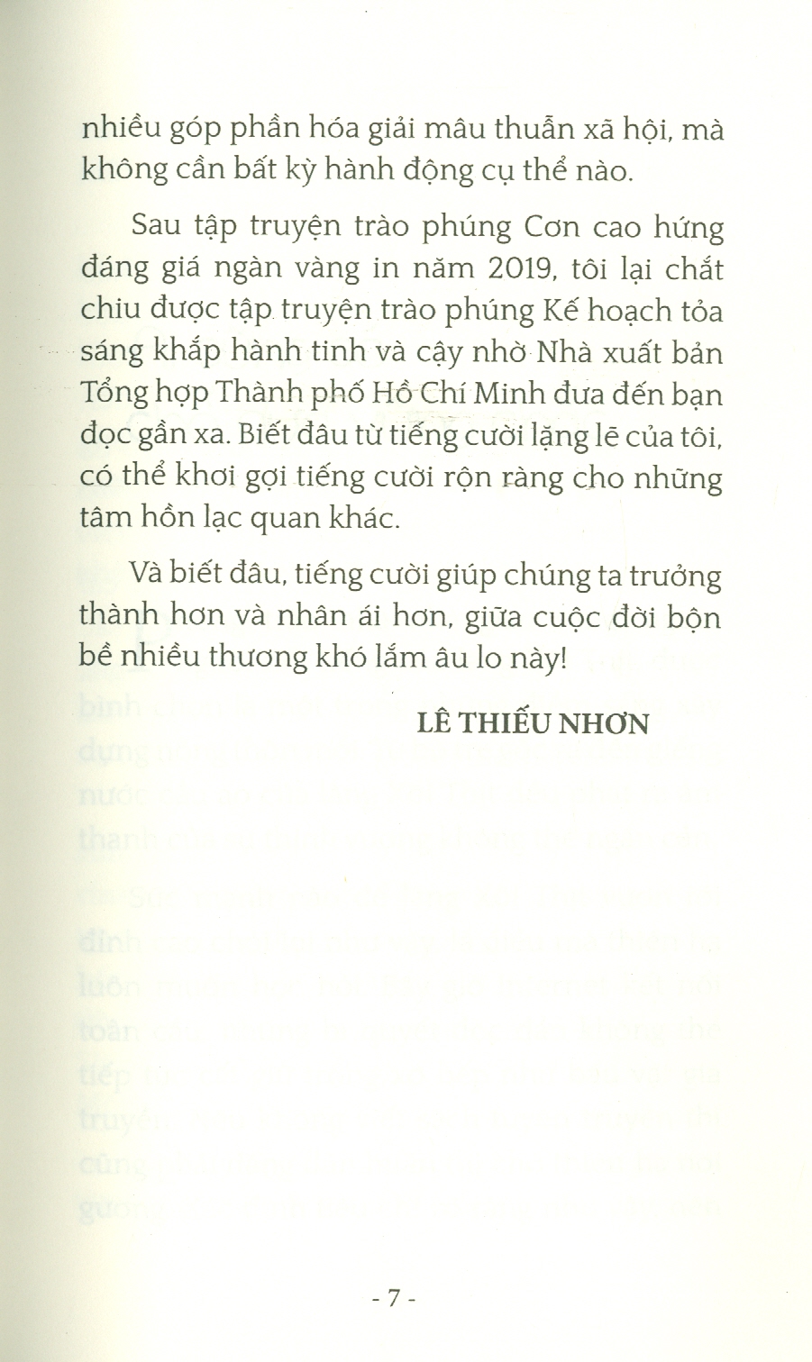 Truyện trào phúng dù ngăn dù dài, cũng là một thể loại văn chương dành cho những người biết cười và dám cười. Bởi lẽ, truyện trào phúng lấy tiếng cười để khái quát những sự kiện nóng bỏng và những nhân vật xung quanh. Những sự kiện được soi rọi kiểu lắt léo và những nhân vật được tái hiện kiểu hí lộng, như một dị bản của bộ óc tưởng tượng, như một hồi âm của trái tim ân cần. Chốc lát vui nhộn thôi, không gây hại ai cả. Thế nhưng, chính tiếng cười cá nhân sẽ ít nhiêu góp phần hóa giải mâu thuẫn xã hội, mà không cần bất kỳ hành động cụ thể nào.