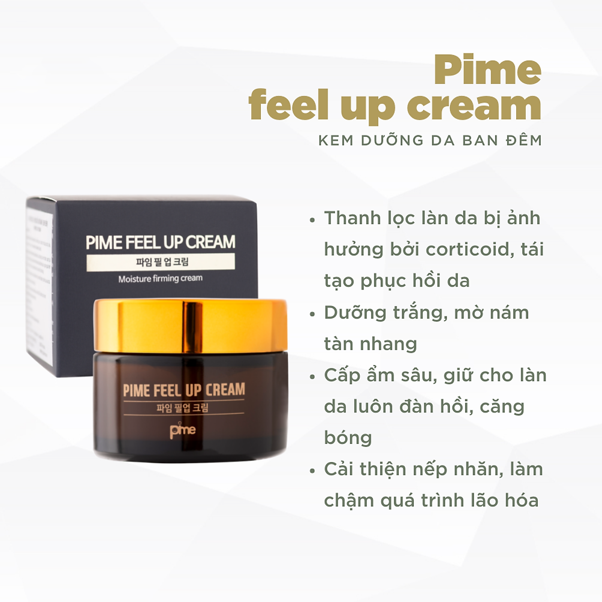 KEM BAN ĐÊM PHỤC HỒI TÁI TẠO PIME FEEL UP CREAM 50G KEM BAN ĐÊM PHỤC HỒI TÁI TẠO PIME chứa nhiều dưỡng chất giúp trắng da, căng bóng, làm mờ thâm, nám, tái tạo,