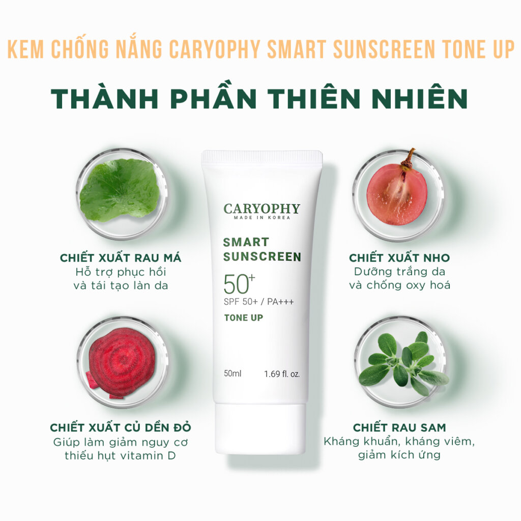 - Bên cạnh đó, Kem chống nắng Caryophy Smart Sunscreen có các thành phần thiên nhiên an toàn và lành tính phù hợp với mọi loại da, kể cả làn da nhạy cảm.