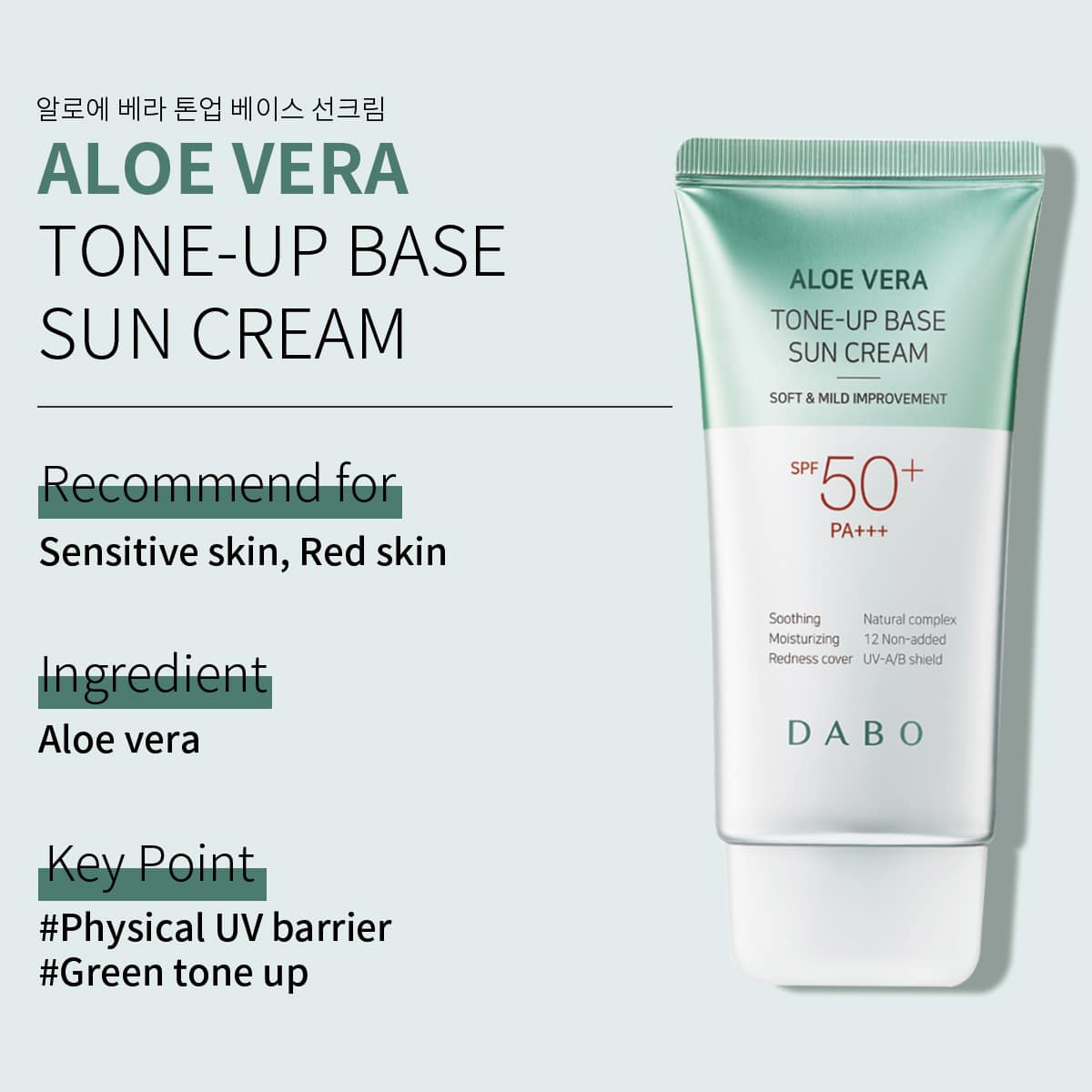 Kem chống nắng DABO Aloe Vera Tone Up với chỉ số chống nắng SPF50 PA+++ bảo vệ da khỏi tia UVA/UVB rất hiệu quả, tinh chất Lô hội tinh khiết kết hợp với Trà xanh (Camellia Extract), Rau má (Centella Asiatica)... Giúp cấp ẩm, kháng khuẩn, ngừa mụn, tái tạo tế bào da, cung cấp Vitamin mang lại da trắng hồng, mịn màng và khỏe mạnh. Kem nâng Tone cho lớp Make-Up tự nhiên. KCN sử dụng tốt cả ngoài trời hoặc trong nhà, hiệu quả đặc biệt với da khô.