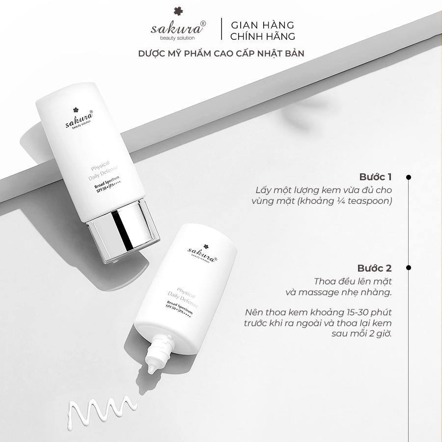 NHŨ TƯƠNG CHỐNG NẮNG VẬT LÝ SAKURA PHYSICAL DAILY DEFENSE SPF 50+ PA ++++ 60G Nhũ tương chống nắng vật lý Sakura Physical Daily Defense SPF 50+ PA ++++ làvới công thức dạng nhũ tương dịu nhẹ, hoàn toàn không chứa Silicon, dầu và cồn khoáng, Là giải pháp an toàn cho những ai muốn bảo vệ da khỏi ánh nắng mặt trời nhưng không muốn lưu lại lớp kem bao phủ dày và trắng bệt trên bề mặt da, điều này hoàn toàn khác biệt với các loại kem chống nắng và kem lót trang điểm khác. ►CÔNG DỤNG