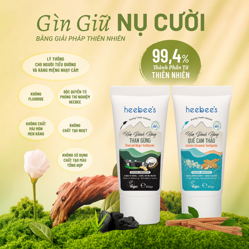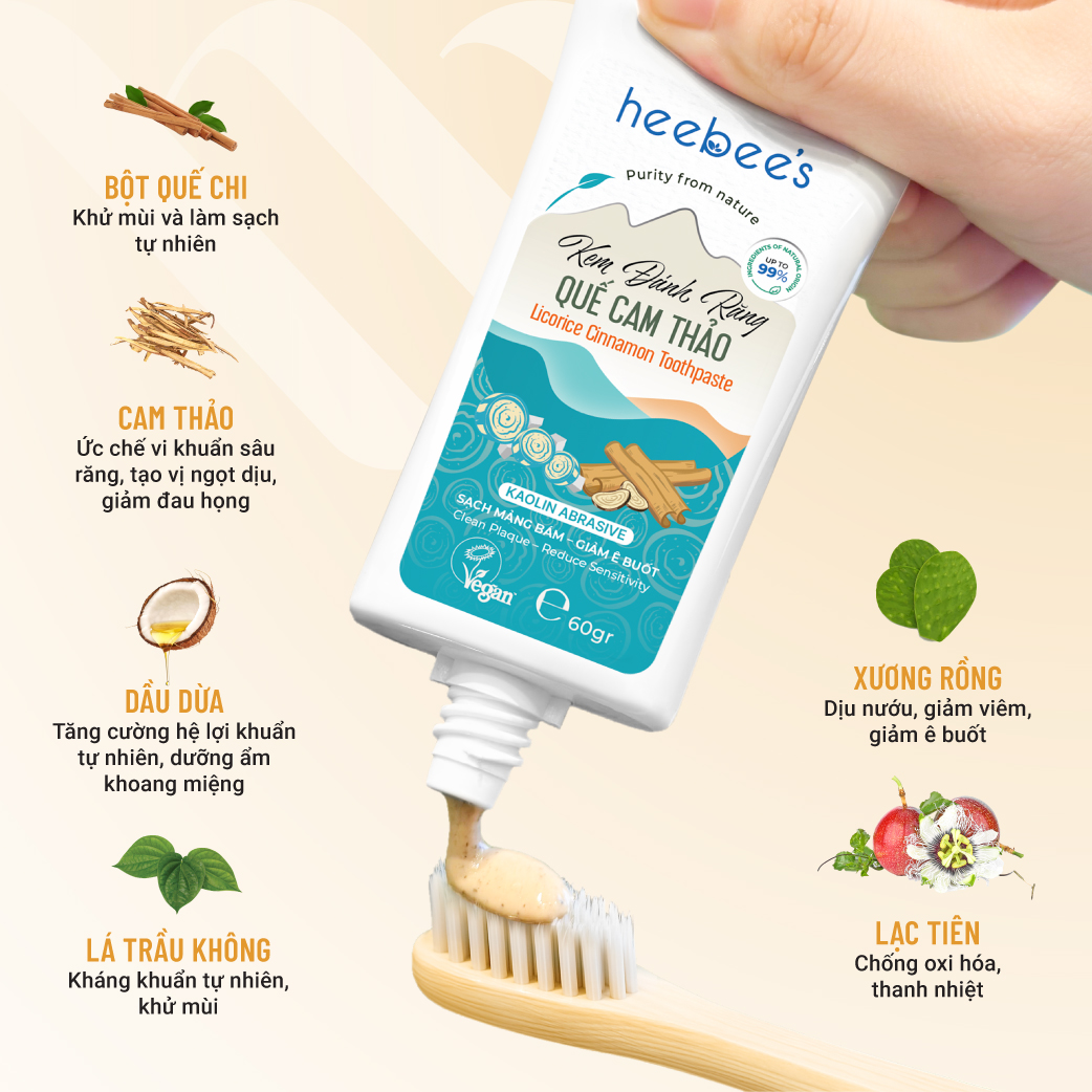 Mua tại TiktokKem Đánh Răng Thảo Dược Thuần Chay Quế Cam Thảo - Sạch Mảng Bám, Giảm Ê Buốt 60 Gram ĐIỂM NỔI BẬT Kem đánh răng Quế Cam Thảo là sự kết hợp tiên phong giữa Kaolin nguyên khoáng, Cam Thảo ấm dịu và Bột Quế Chi nồng nàn. Không chỉ thanh lọc và làm sạch nhẹ nhàng, công thức còn nuôi dưỡng khoang miệng bằng thảo dược thuần chay, nâng niu từng chiếc răng nhạy cảm với độ pH lý tưởng và thành phần giàu hoạt chất kháng viêm – giúp bạn khởi đầu ngày mới bằng hơi thở thơm mát, và nụ cười êm dịu, khỏe khoắn từ sâu bên trong. THÀNH PHẦN CHÍNH ĐIỀU GÌ KHIẾN KEM ĐÁNH RĂNG THẢO DƯỢC QUẾ CAM THẢO HEEBEE'S KHÁC BIỆT? CAM KẾT SẢN PHẨM CÔNG DỤNG ‣ Làm sạch cao răng và mảng bám trên răng ‣ Giảm tình trạng ê buốt và viêm nướu ‣ Giảm mùi hôi khoang miệng, hơi thở thơm mát dài lâu ‣ Ngăn ngừa sâu răng, bảo vệ răng nướu chắc khỏe mỗi ngày ĐỐI TƯỢNG SỬ DỤNG ‣ Phù hợp cho mọi lứa tuổi và đối tượng ‣ Thích hợp cho các tình trạng răng nhạy cảm và ê buốt ‣ An toàn cho thai phụ và trẻ nhỏ ‣ Trẻ em dưới 6 tuổi chỉ nên sử dụng một lượng kem tương đương với kích thước của một hạt đậu và cần được người lớn giám sát để tránh nuốt phải sản phẩm CÁCH SỬ DỤNG ‣ Lấy một lượng kem vừa đủ ‣ Súc miệng nhẹ để làm ẩm khoang miệng và loại bỏ mảng bám lớn ‣ Chải răng nhẹ nhàng, đều tay trên toàn bộ bề mặt răng, theo đúng hướng dẫn của Nha sĩ ‣ Súc miệng lại với nước Để hiệu quả làm sạch x2 và hơi thở luôn thơm mát, khuyến khích dùng Nước Súc Miệng Thảo Dược Thuần Chay Đinh Hương Heebee’s HƯỚNG DẪN BẢO QUẢN ‣ Bảo quản nơi khô ráo, thoáng mát, tránh ánh nắng trực tiếp và nhiệt độ cao ‣ Đậy nắp kín sau khi sử dụng THÀNH PHẦN CHI TIẾT Water, Sorbitol, Kaolin (20%), Glycyrrhiza Uralensis Root Extract, Glycerin, Decyl Glucoside, Propanediol, Cocos Nucifera Oil, Isosorbide, Cinnamomum Zeylanicum Bark Powder, Piper Betle Leaf Extract, Opuntia Ficus-Indica Extract, Phenoxyethanol, Menthol, Glycolipids, Carbomer, Passiflora Laurifolia Flower Extract, Xanthan Gum, Ethylhexylglycerin, Triethanolamine.