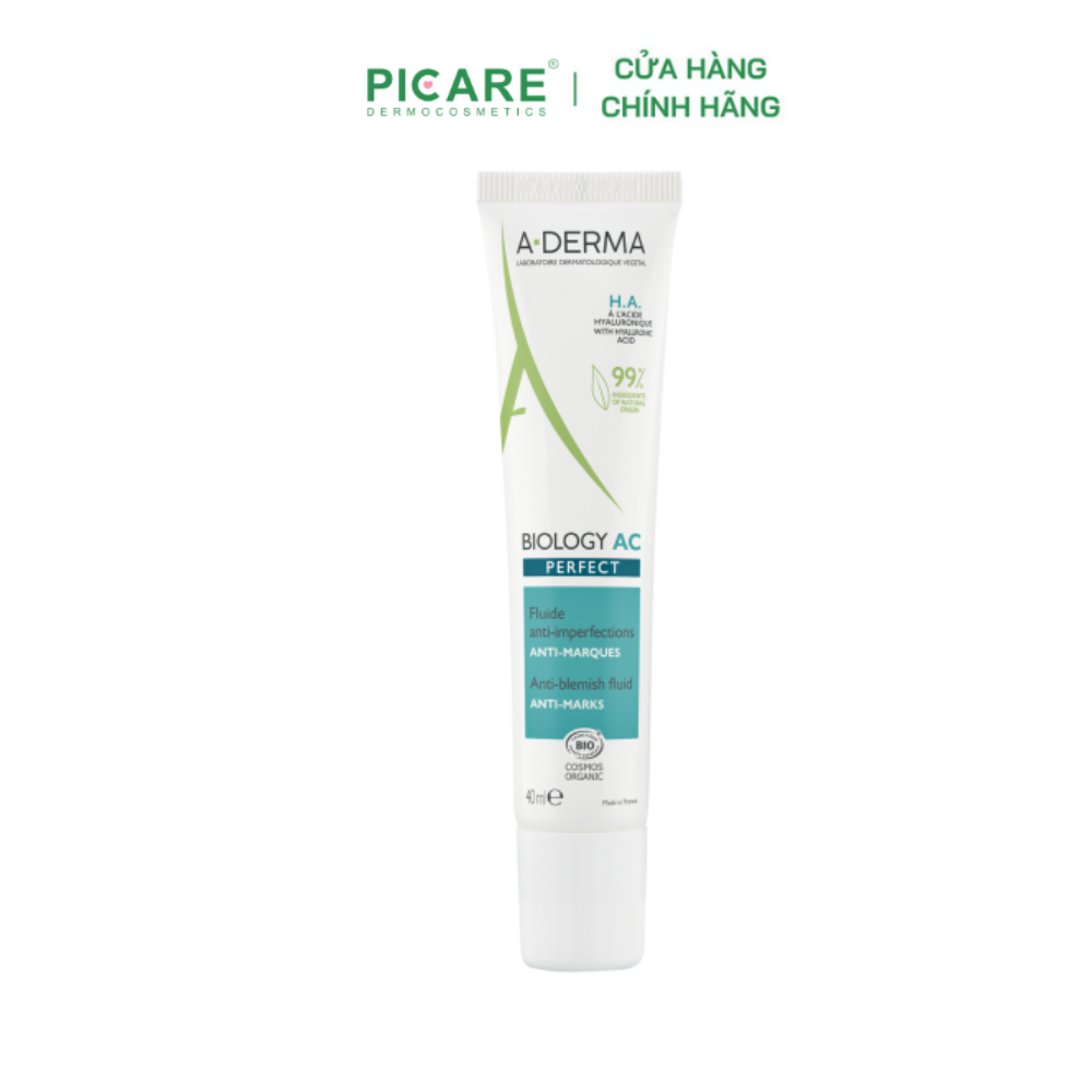 1. Công dụng Kem Dưỡng Làm Giảm Và Ngăn Ngừa Mụn A-derma Biology AC Perfect Fluid 40ml chuyên biệt dành cho da mụn từ thương hiệu dược mỹ phẩm A-DERMA, giúp làm giảm lượng bã nhờn dư thừa và hạn chế vi khuẩn gây mụn bám vào da; làm dịu và giảm thiểu mẩn đỏ do kích ứng, loại bỏ tế bào chết và tạp chất sâu trong lỗ chân lông; đồng thời ngăn ngừa hình thành thâm sẹo sau mụn. Đặc biệt, công thức được chiết xuất từ thực vật giúp mang lại hiệu quả & độ dung nạp trên da cao. Kếu cấu siêu lỏng nhẹ, thẩm thấu nhanh vào da, thích hợp sử dụng cả ngày và đêm.