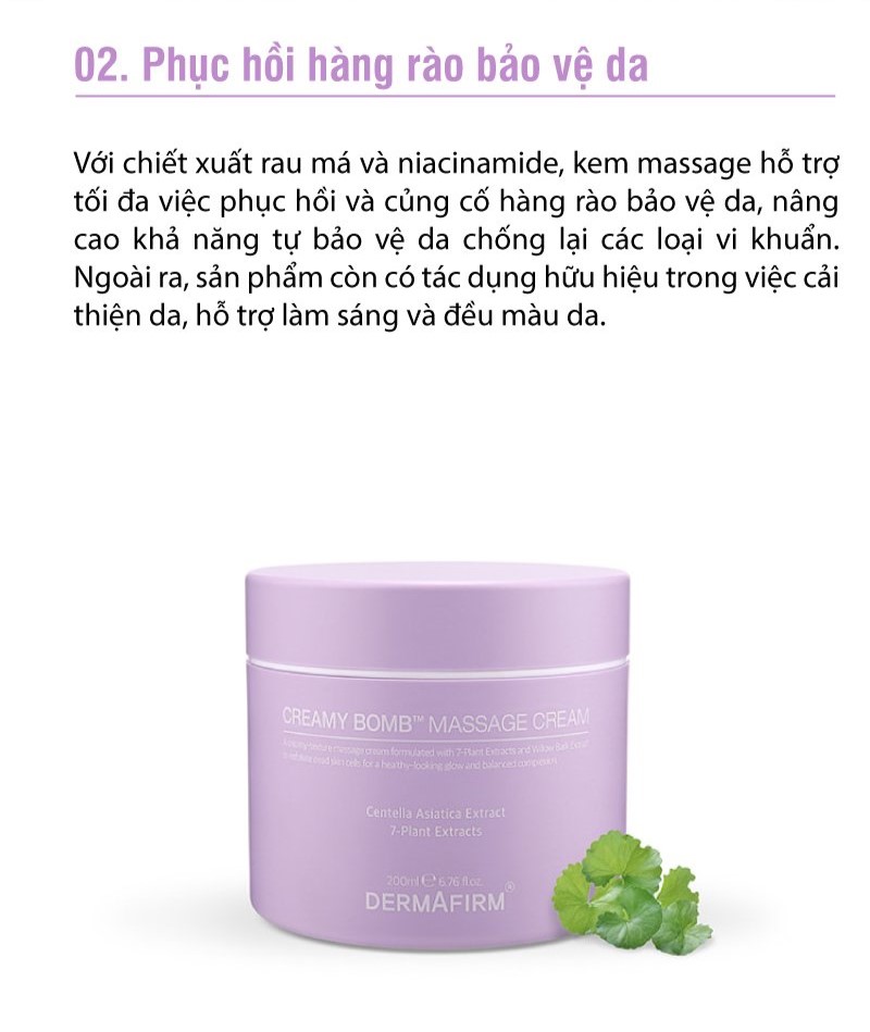 - Dưỡng ẩm mà không gây kích ứng cho làn da. Creamy Bomb Massage Cream sử dụng hàng ngày dành cho làn da mệt mỏi, làn da thường xuyên đeo khẩu trang, tiếp xúc với khói bụi, nhạy cảm, kích ứng, khô nẻ, thô ráp. Đây là giải pháp chăm sóc da chuyên sâu tiết kiệm thời gian cho những người bận rộn. Giúp làn da được chăm sóc dịu dàng vừa được thư giãn sau 1 ngày bận rộn. ƯU ĐIỂM 01: Món quà kì diệu cho làn da. Thư giãn thực sự Chiết xuất rau má - thành phần tuyệt vời giúp làm dịu da. Chiết xuất 7 loại thực vật giúp tăng cường đề kháng và phục hồi sức sống cho làn da mệt mỏi: chiết xuất rau má, chiết xuất trà xanh, chiết xuất rễ cây Hojanggun, chiết xuất vàng, chiết xuất lá hương thảo, chiết xuất rễ cam thảo Tây Ban Nha, chiết xuất hoa Matricaria Chiết xuất rau má (còn được gọi là cỏ hổ) được khoa học chứng minh giúp làm lành vết thương, phục hồi da thương tổn, làm dịu da, tăng sinh collagen và giảm lão hóa, cho làn da vẻ ngoài mịn màng. ƯU ĐIỂM 02: Mịn màng Sử dụng tay hoặc thanh massage để massage mặt với kem. Massage mặt với kem massage giúp lấy đi dễ dàng các tế bào chết trên làn da. Cảm nhận ngay một làn da mềm mại, mịn màng sau khi massage. ƯU ĐIỂM 03: Mềm và sạch thoáng Làm sạch bụi bẩn, tế bào chết Sallicylic Acid được chiết xuất từ vỏ cây liễu trắng giúp loại bỏ bụi bẩn, da chết một cách nhẹ nhàng, hiệu quả. Rửa lại mặt bằng nước sạch để làm sạch da sau khi massage. ƯU ĐIỂM 04: Thân thiện với làn da Dưỡng ẩm nhẹ nhàng Thành phần Squalane giúp làn da sạch thoáng. Kem massage cung cấp lượng lớn dưỡng chất cho làn da giúp da ẩm mượt và mịn màng. CẢM QUAN VỀ SẢN PHẨM: Công thức kem mịn, thoáng da sẽ giúp làn da hấp thụ tối đa dưỡng chất nhờ sức nóng của bàn tay trong khi massage mặt. HƯỚNG DẪN SỬ DỤNG