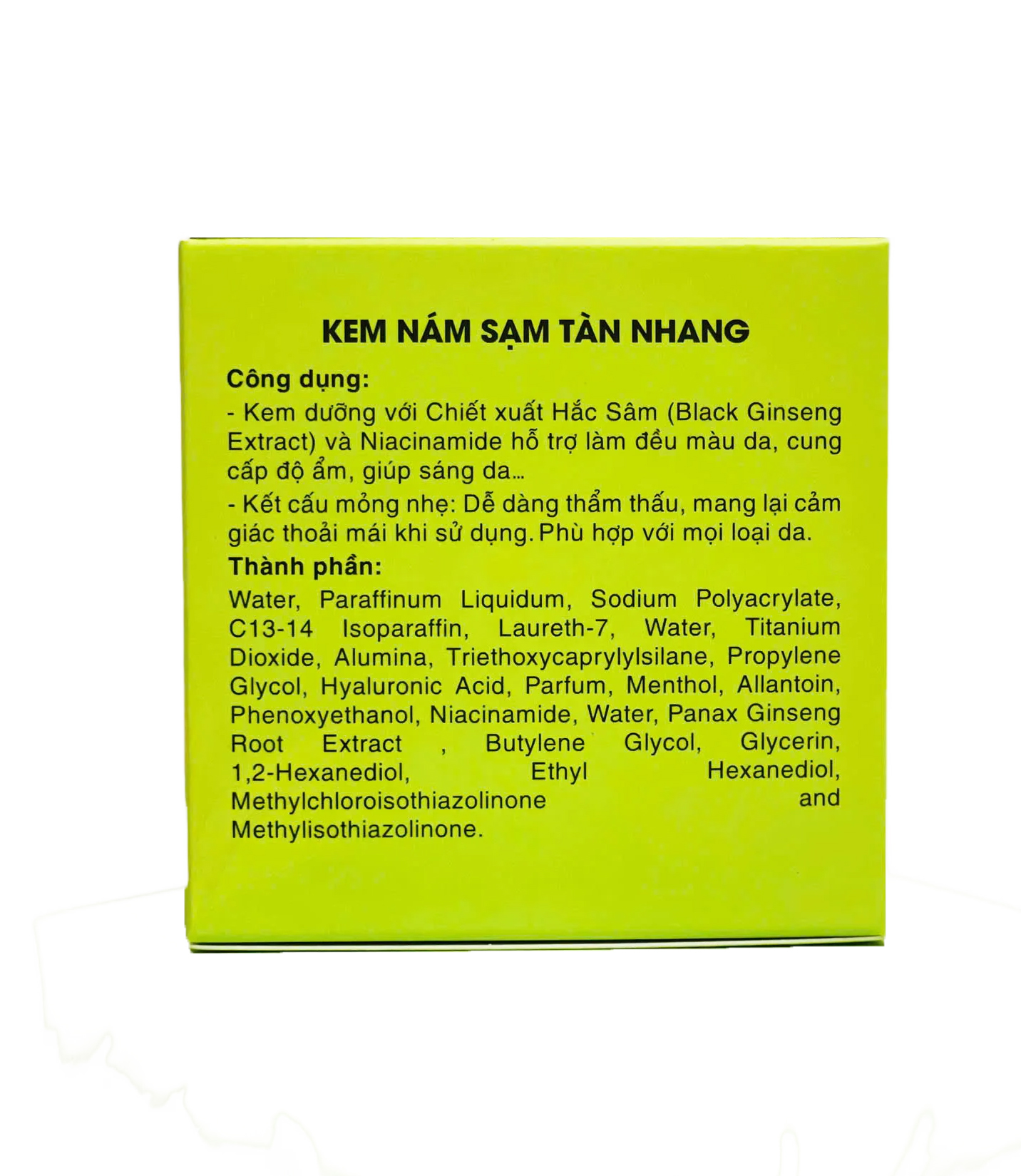 Công dụng: Kem dưỡng với Chiết xuất Hắc Sâm (Black Ginseng Extract) và Niacinamide hỗ trợ làm đều màu da, cung cấp độ ẩm, giúp sáng da… Kết cấu mỏng nhẹ: Dễ dàng thẩm thấu,