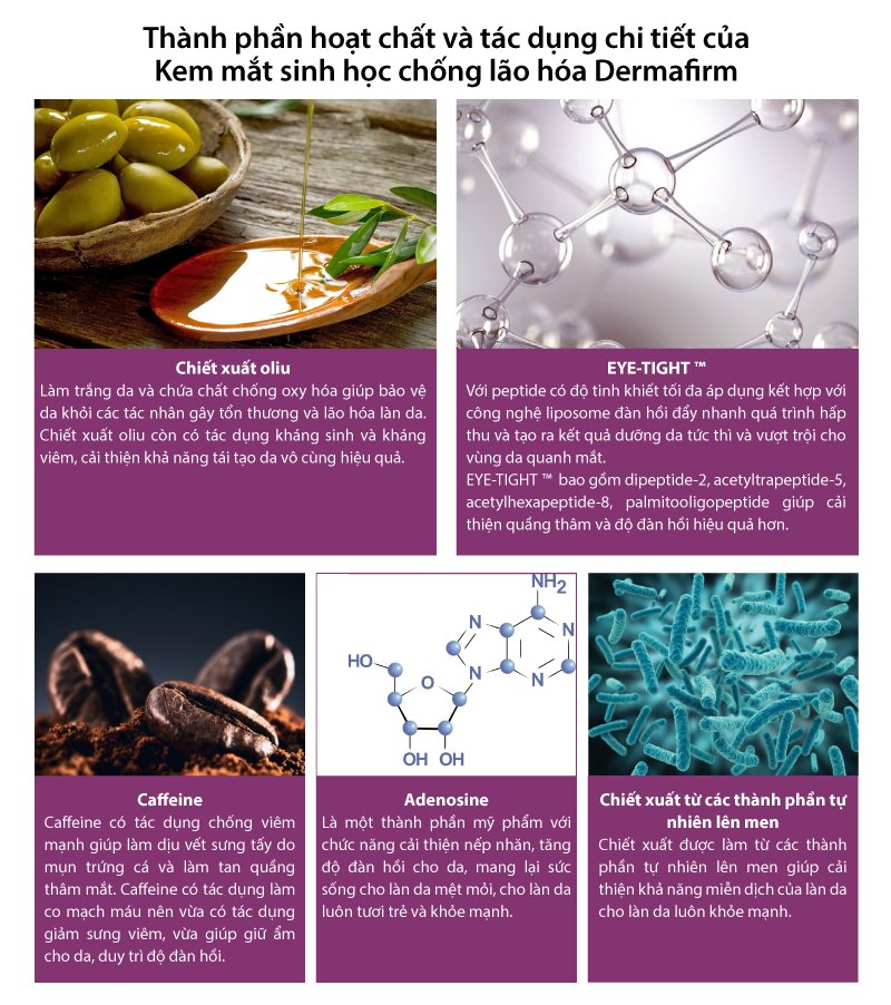 - EYE-TIGHT : Peptide độ tinh khiết cao tự sản xuất của Dermafirm áp dụng công nghệ liposome đàn hồi được hấp thụ tốt, tạo ra hiệu quả nhanh hơn và tức thì hơn để cải thiện quầng thâm và quầng mắt và độ đàn hồi. EYE-TIGHT có thể tăng khả năng hấp thụ hơn 200% so với các thành phần hoạt chất không bao bọc bởi liposome, giúp giải quyết các vấn đề về da quanh mắt nhanh chóng hơn.