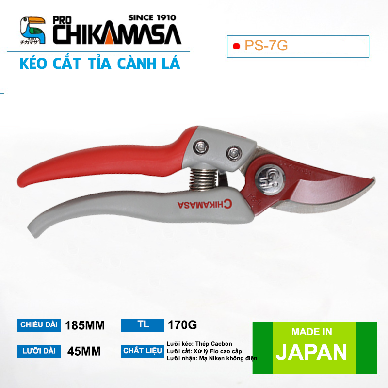 Kéo cắt tỉa cành cây Chikamasa PS-7G thích hợp cho việc cắt tỉa gọn gàng những cành cây nhỏ, nông dân trồng nho, tiêu hoặc cafe . Kéo cắt tỉa cành cây Chikamasa PS-7G tạo lực