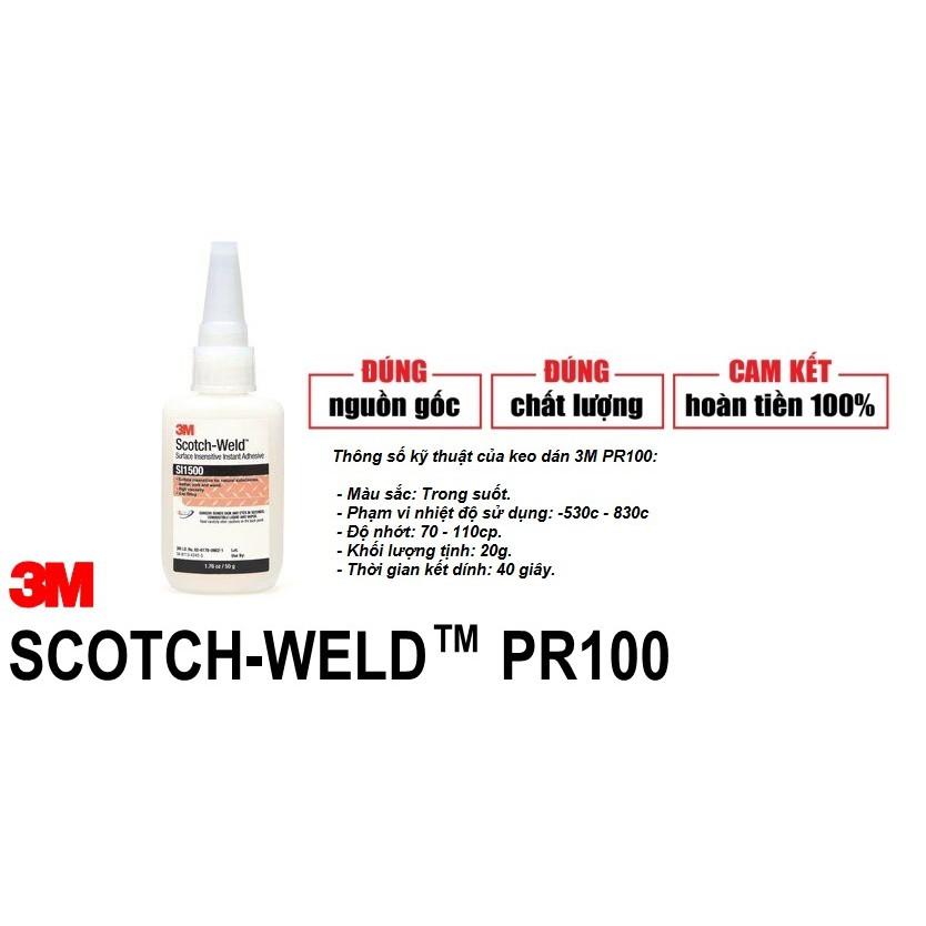 Mua tại TiktokHOT ! HOT ! THEO DÕI GIAN HÀNG DE' BLUR NGAY GIẢM 5% CHO KHÁCH HÀNG MỚI ƯU ĐÃI TỐT CHO KHÁCH HÀNG CŨ , INB SHOP ĐỂ BIẾT THÊM Keo Siêu Dính 3M PR100 Scotch-Weld Plastic & Rubber Instant Adhesive 20g là keo loãng, dễ sử dụng chuyên dùng dán nhựa và cao su, đặc biệt dùng cho các bề mặt khó dán, như là EPDM, Viton) và nylon. Thông số kỹ thuật: