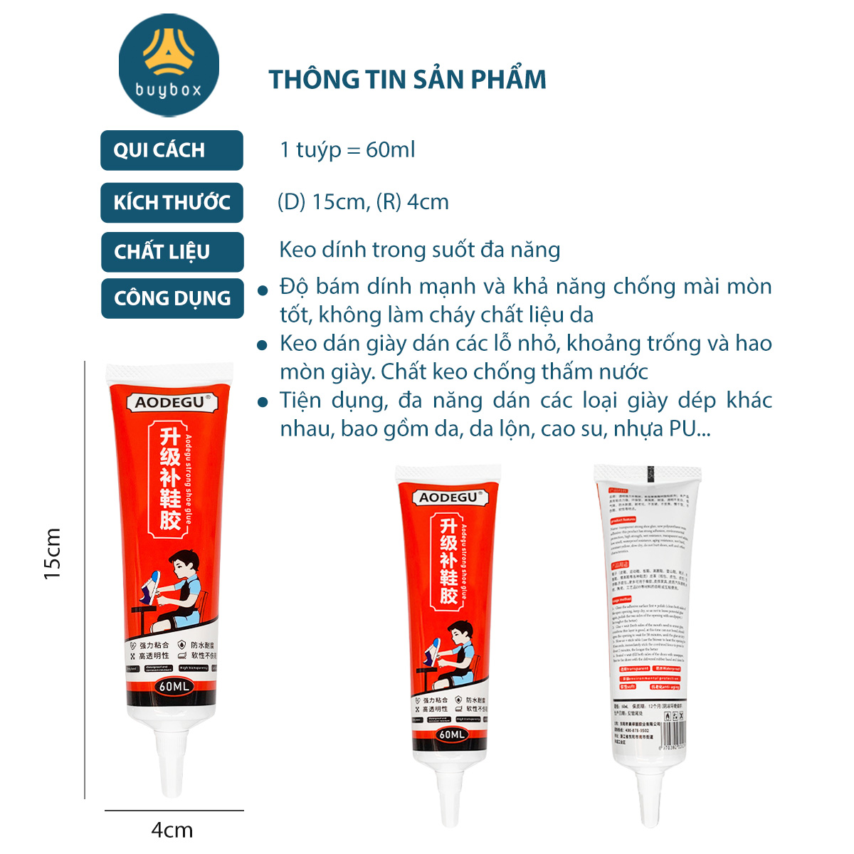 Bạn có bao giờ gặp phải tình huống khó xử khi đôi giày yêu thương của mình bị rách, đứt dây hoặc cần một chút sửa chữa nhỏ? Đừng lo lắng nữa! Keo dán giày đa năng với đầu kim là giải pháp hoàn hảo để giúp bạn sửa chữa và bảo trì giày dép một cách nhanh chóng và dễ dàng. Với keo dán giày đa năng, bạn có thể tự tin sửa chữa những vết rách, đường chỉ đứt hoặc dây giày bị tuột. Đầu kim tích hợp trong ống keo giúp bạn dễ dàng thấu vào các khe hở nhỏ và giữ chắc các mảnh da hoặc vật liệu lại với nhau một cách vững chắc. CÔNG DỤNG SẢN PHẨM: Với đầu kim tích hợp, việc sửa chữa giày dép trở nên đơn giản hơn bao giờ hết. Không gây tắc sau khi sử dụng Độ bám dính mạnh và khả năng chống mài mòn tốt. Keo dán giày dán các lỗ nhỏ, khoảng trống và hao mòn giày. Chất keo lỏng trong suốt chống thấm nước Tiện dụng dán các loại giày dép khác nhau, bao gồm da, da lộn, cao su, cao su tổng hợp và vải bạt; giày đi bộ đường dài, giày chạy bộ hoặc giày đi bộ đường dài, ĐẶC ĐIỂM SẢN PHẨM: Keo dán giày tức khi khô sẽ tạo thành một lớp màng trong suốt và dẻo, không bị bong tróc hay nứt nẻ theo thời gian. Keo dán giày đa năng có thể được sử dụng cho nhiều loại vật liệu, bao gồm da, vải, cao su và nhiều hơn nữa. Điều này giúp bạn dễ dàng sửa chữa không chỉ giày dép mà còn các vật dụng khác như ví, túi xách hay thắt lưng. Keo dán làm từ các thành phần không gây hại và an toàn cho sức khỏe. Bạn có thể sử dụng nó một cách tự tin mà không cần lo ngại về tác động tiêu cực đến sức khỏe của bạn. Kích thước nhỏ gọn, dễ mang theo Không gây ra những vết ố vàng làm mất thẩm mỹ sau khi dán như những loại keo dán khác THÔNG TIN SẢN PHẨM: Dung tích: 60 ml Quy cách: 1 tuýt HƯỚNG DẪN SỬ DỤNG