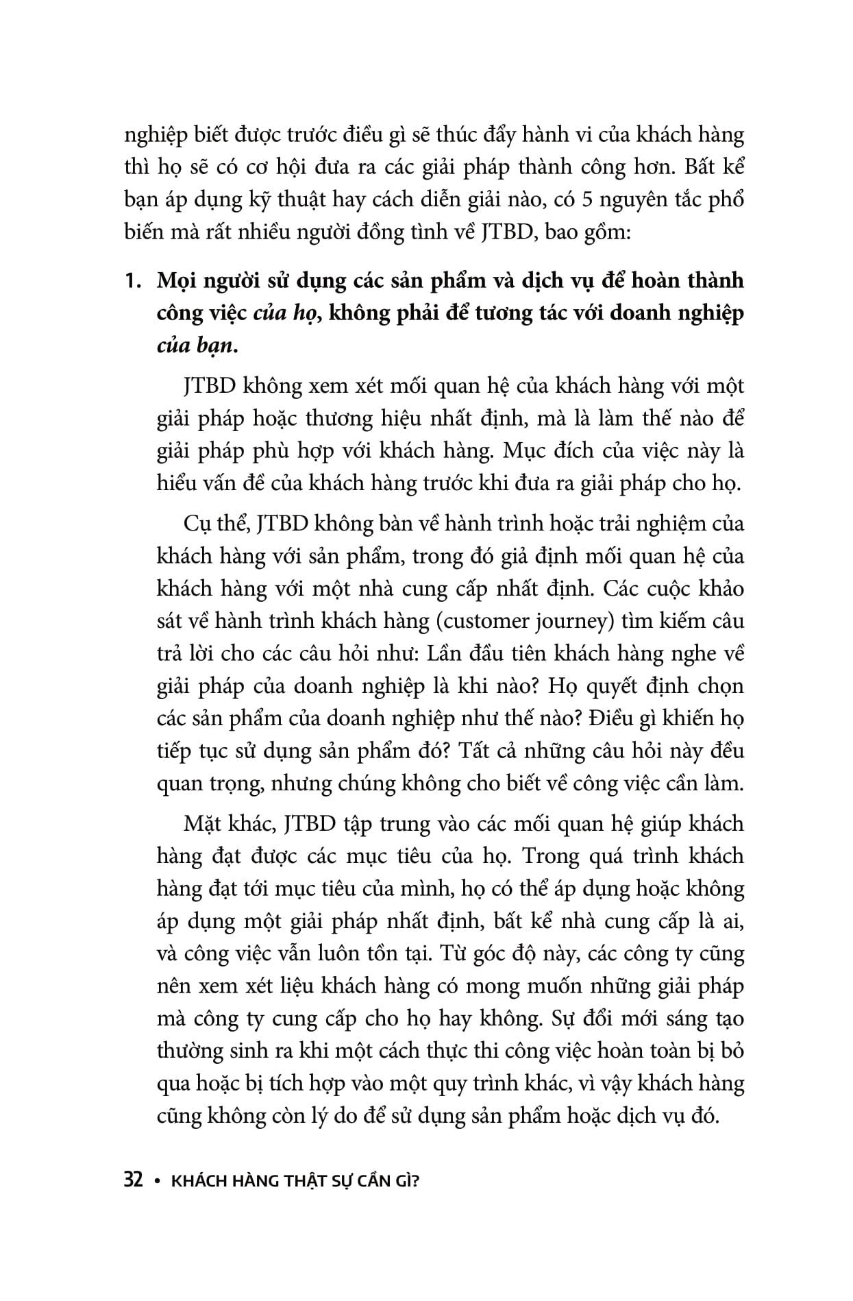 KHÁCH HÀNG THẬT SỰ CẦN GÌ? Giải quyết vấn đề theo tư duy công việc cần làm Tất tần tật về khái niệm Jobs to Be Done (JTBD) Đây là cuốn sách nhập môn hướng dẫn cho bạn về “Job to Be done” (hay JTBD), một lý thuyết đã được nghiên cứu gần 30 năm. Cuốn sách tập hợp các phương pháp đang được thực hành hiện nay mà tác giả Jim Kalbach gọi là “các chiến thuật”, mượn cách nói ẩn dụ “sổ tay chiến thuật” trong thể thao. Về cơ bản, chiến thuật là các kỹ thuật riêng lẻ tạo nền tảng để thực hiện JTBD. Mục đích của cuốn sách The Jobs to Be Done Playbook: Align Your Markets, Organization, and Strategy Around Customer Needs là cung cấp cho bạn một bản tham chiếu về các phương pháp tiếp cận khác nhau trong JTBD trên thực tế. Nhưng hãy nhớ rằng các phương pháp được trình bày trong cuốn sách này vẫn chưa phải là tất cả. Các tài liệu này được đưa ra dựa trên nghiên cứu của tác giả Jim Kalbach về JTBD và cách ông áp dụng các kỹ thuật trong JTBD cho công việc suốt 10 năm qua. Khi viết cuốn sách này, tác giả Jim Kalbach cũng có nhận thức sâu sắc về những thiếu sót của JTBD. Giống như bất kỳ phương pháp nào khác, JTBD không phải giải pháp cho mọi vấn đề mà sẽ có sự đánh đổi khi thực hành chúng. Khi bạn đọc cuốn sách này với tư duy phản biện, bạn nên lưu tâm những lợi ích sau đây của JTBD. ■ Thứ nhất, JTBD tập trung vào một đơn vị phân tích – đó là “công việc”. Sau đó, các nhu cầu, cảm xúc và nguyện vọng của khách hàng sẽ được nhìn nhận trong mối quan hệ với “công việc”, dựa trên sự hiểu biết về công việc chính. ■ Thứ hai, vì JTBD không bắt nguồn từ một chuyên ngành cụ thể, chẳng hạn như thiết kế hay marketing, nên các đội nhóm khác có thể dễ dàng áp dụng cách tiếp cận này để thấu hiểu khách hàng theo cách của họ. ■ Thứ ba, bởi vì JTBD xem mục tiêu của một cá nhân là độc lập với công nghệ nên phương pháp này chứng minh suy nghĩ của bạn sẽ thành hiện thực như thế nào trong tương lai. Việc định nghĩa công việc càng đại chúng càng có thể giúp bạn tạo ra các giải pháp tốt hơn cho khách hàng trong tương lai mà không bị ràng buộc với quá khứ. Bạn có thể cảm thấy không thoải mái khi mới áp dụng JTBD và cần thời gian để thực hành. “Khách Hàng Thật Sự Cần Gì?” được sắp xếp thế nào? “Việc cốt lõi mà bất kỳ doanh nghiệp nào cũng cố gắng hoàn thành là gì?”. Peter Drucker gợi cho chúng ta một câu trả lời rất hay: “Chỉ có một định nghĩa duy nhất cho mục đích kinh doanh: tạo ra khách hàng. Doanh nghiệp tồn tại để tạo ra giá trị – giá trị cho khách hàng được thể hiện qua việc doanh nghiệp thỏa mãn nhu cầu của họ (đổi mới sáng tạo) và giá trị cho doanh nghiệp được thể hiện bằng cách duy trì lợi nhuận (tiếp cận thị trường). Từ góc độ này, tác giả đã sắp xếp các kỹ thuật hay chiến thuật trong “Khách Hàng Thật Sự Cần Gì?” theo 5 giai đoạn cung cấp các giải pháp mà khách hàng thấy có giá trị: Khám phá giá trị: Tìm đúng vấn đề cần giải quyết cho khách hàng. Định nghĩa giá trị: Thiết lập hướng giải quyết vấn đề đã xác định được. Thiết kế giá trị: Tạo ra các giải pháp được mong đợi, có tính khả thi và hữu ích. Cung cấp giá trị: Đưa giải pháp ra thị trường theo một mô hình kinh doanh thành công. (Tái) phát triển giá trị: Tiếp tục đổi mới sáng tạo và phát triển doanh nghiệp.