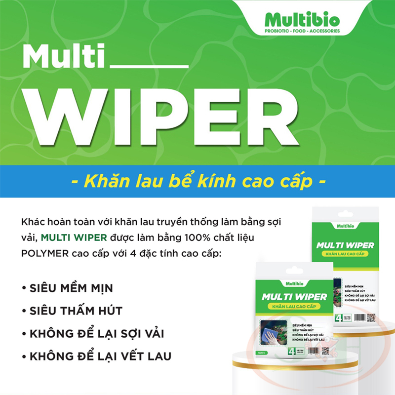 Khăn lau kính Multi Wiper là sản phẩm chuyên dụng cho việc lau kính bể cá cảnh. Khác với các loại khăn bông thông thường, khăn Multi Wiper được là từ chất liệu polymer cao cấp siêu mềm mịn, thấm hút tốt nên hoàn toàn không để lại sợi vải hay vết nước sau khi lau.