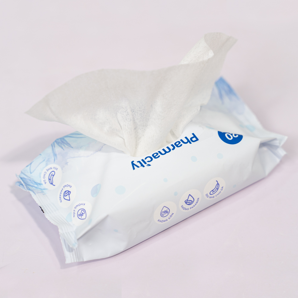 Khăn ướt Pharmacity được làm từ chất liệu vải không dệt, mịn màng, mềm mại và không nhờn da, êm ái khi tiếp xúc trên da.