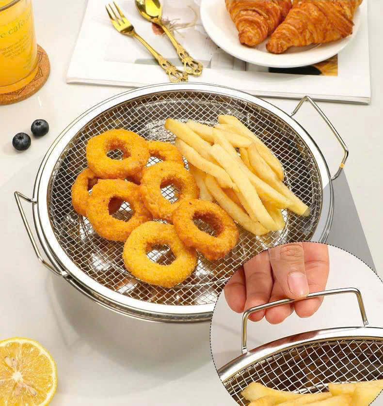 Khay tròn inox 304 kèm ray lưới lọc ráo dầu chiên thức ăn là một dụng cụ bếp tiện ích không thể thiếu trong mỗi gia đình, quán ăn, hay nhà hàng. Với thiết kế thông minh và chất liệu inox 304 bền bỉ, sản phẩm giúp bạn dễ dàng chiên, rán thực phẩm mà không lo bị dầu mỡ bám lại, đồng thời giúp thức ăn ráo dầu, giòn ngon hơn.