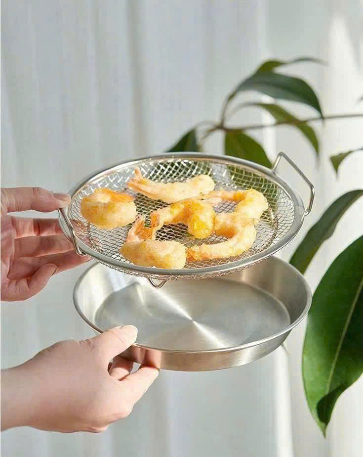 Khay Tròn Inox 304 Kèm Ray Lưới Lọc Ráo Dầu Chiên Thức Ăn Đa Năng Tiện Dụng 19cm Khay tròn inox 304 kèm ray lưới lọc ráo dầu chiên thức ăn là một dụng cụ
