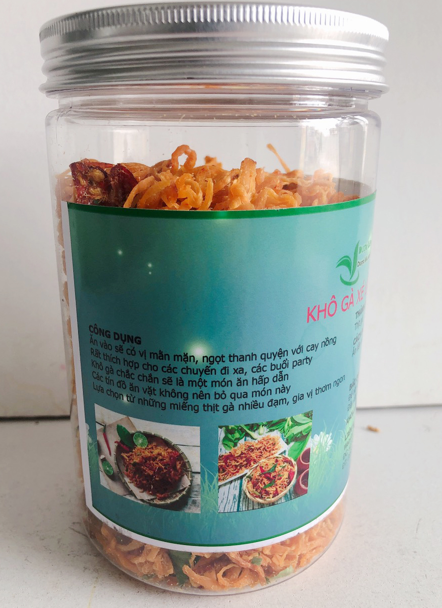 KHÔ GÀ XÉ LÁ CHANH THƯỢNG HẠNG Xuất xứ: Việt Nam. Hạn sử dụng: 12 tháng kể từ ngày sản xuất. Quy cách đóng gói: hủ nhựa pet cao cấp Khô gà xe lá chanh