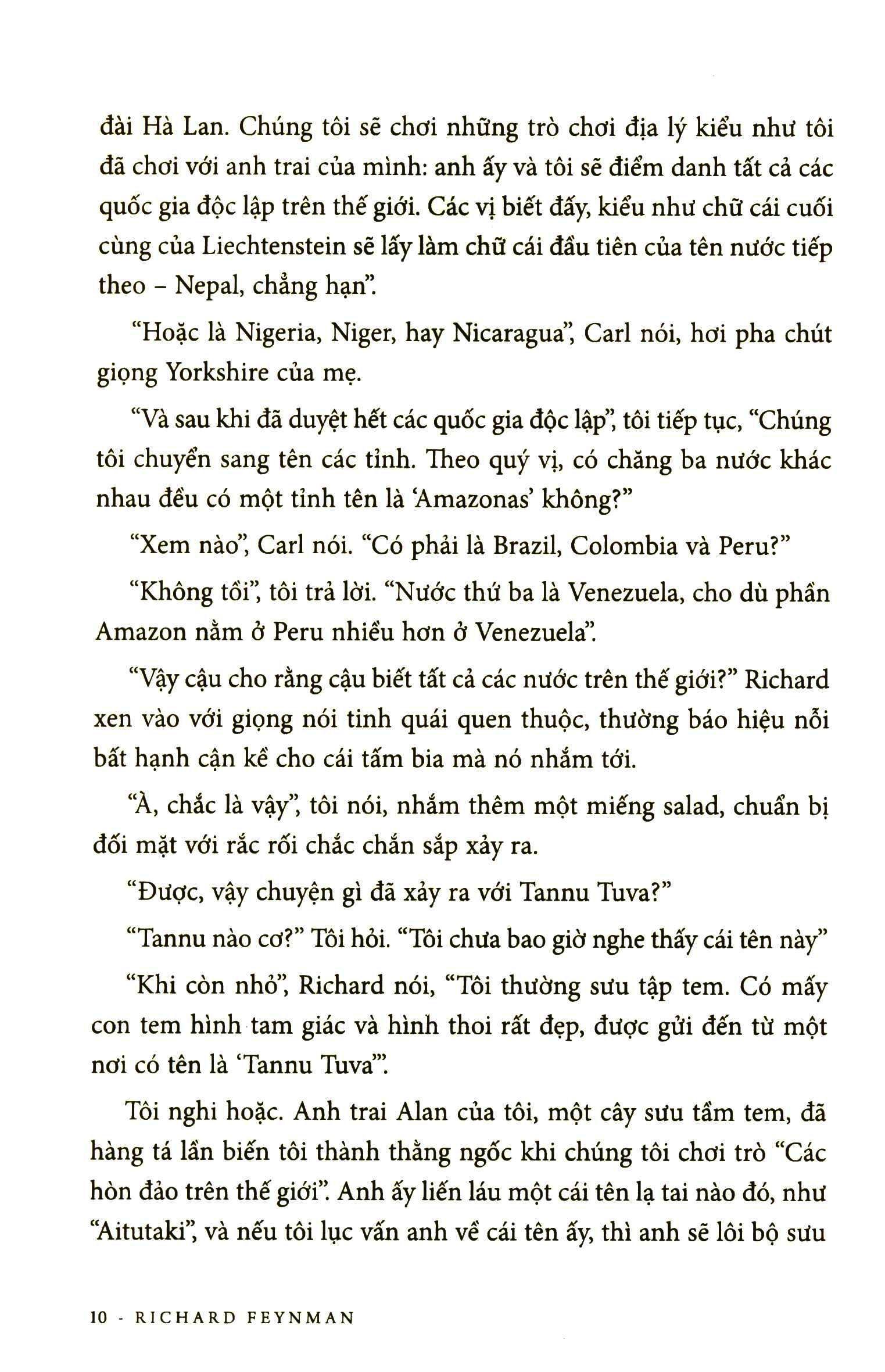 Richard Feynman, một nhà vật lý vĩ đại, một người thầy tuyệt vời, người truyền cảm hứng, một kẻ tò mò, một tay trống, một kẻ phá két, một họa sĩ… dù với cách gọi nào thì cuộc đời của ông là những cuộc phiêu lưu, những trải nghiệm nối tiếp nhau, rất tự nhiên và cũng rất lôi cuốn. Cuộc phiêu lưu cuối cùng của Feynman là cuộc phiêu lưu của ông và Ralph Leighton bắt đầu từ cái tên có cách đánh vần rất lạ của một thủ đô: Kyzyl. Họ cùng nhau tìm tòi, học hỏi ngôn ngữ, vượt qua ranh giới địa lý lẫn tư tưởng để cố gắng đến được Tuva, một đất nước nhỏ bé nằm ở trung tâm châu Á, gần như tách biệt và ít chịu ảnh hưởng bởi thế giới hiện đại, với những loài động vật kỳ lạ, những căn lều tròn, những Shaman… và giọng hát họng đặc sắc. Không ai biết trước được điều gì sẽ xảy ra, nhưng thất bại đầu tiên là việc không dám bắt đầu, Feynman đã sống đúng như vậy đến tận những năm tháng cuối cùng.