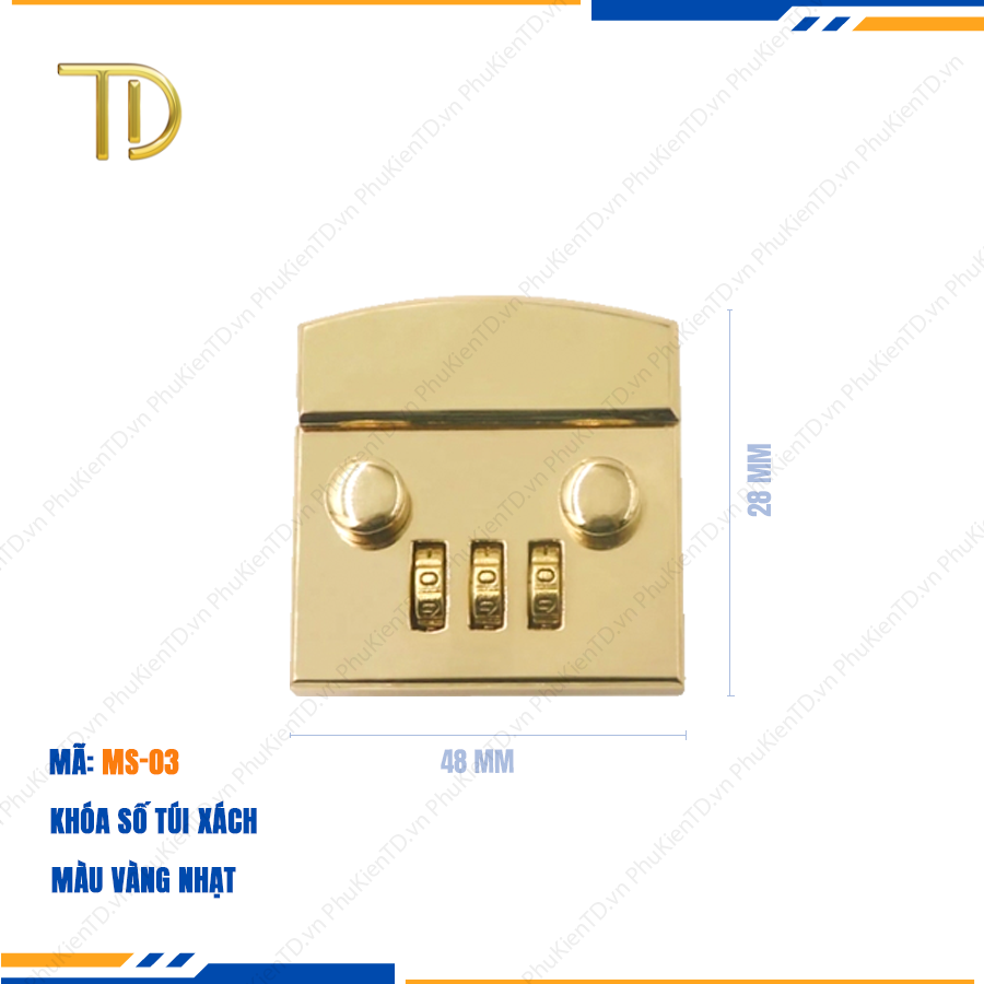 - Hàng luôn có sẵn, giao hàng siêu tốc, freeship toàn quốc THÔNG TIN SẢN PHẨM – Tên sản phẩm : Khóa số túi xách, Khóa 3 số túi xách cao cấp công nghệ mạ điện độ bền 5-8 năm – Thương hiệu: Phụ kiện TD – Chất liệu: Hợp kim cao cấp – Công nghệ: Mạ điện Electroplating, chống ăn mòn, chống rỉ sét, không bay màu. – Kích thước: