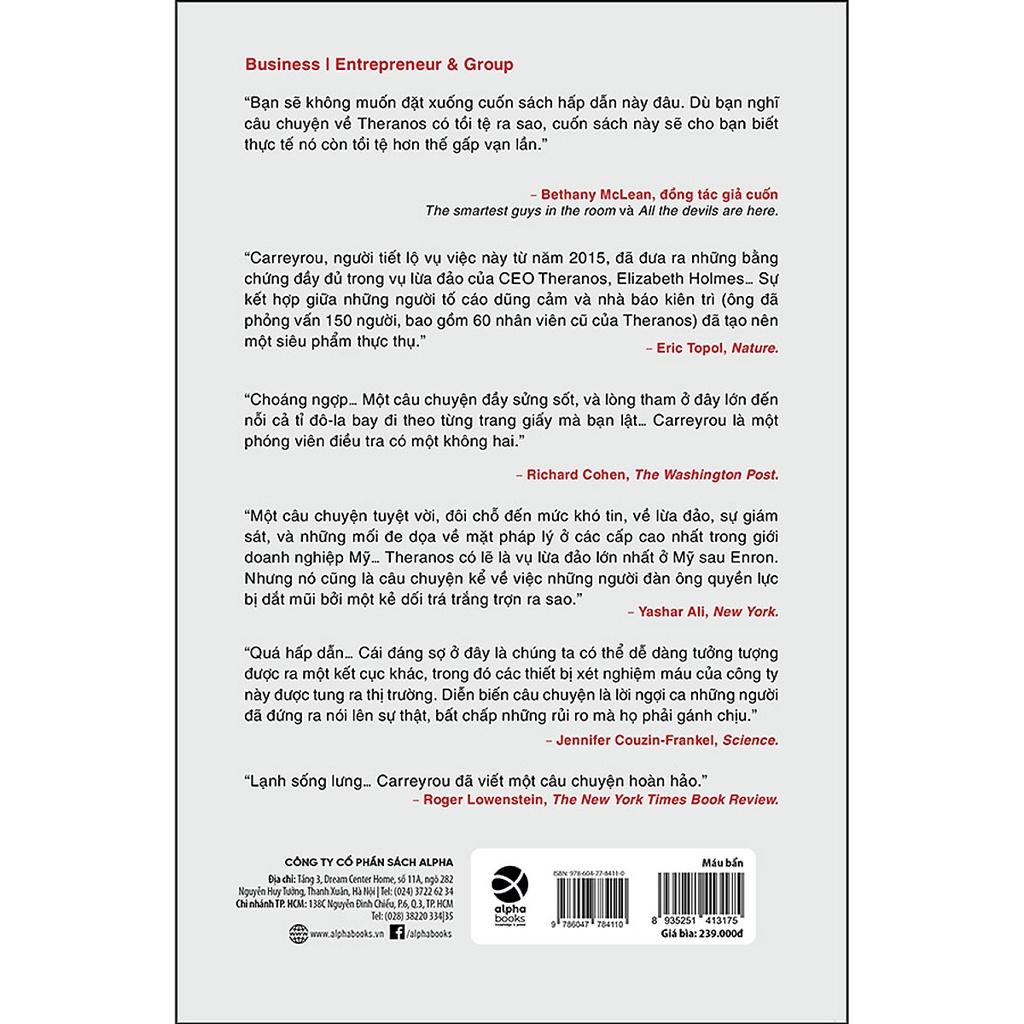 “Câu chuyện này còn điên rồ hơn tôi tưởng, và khi đã mở cuốn sách ra rồi thì tôi không thể đặt nó xuống được nữa. Trong cuốn sách này có tất cả: những trò lừa đảo tinh vi, những âm mưu trong doanh nghiệp, những câu chuyện trang bìa các tạp chí, những mối quan hệ gia đình bị hủy hoại, và sự sụp đổ của một công ty từng được định giá tới gần 10 tỷ đô-la.”