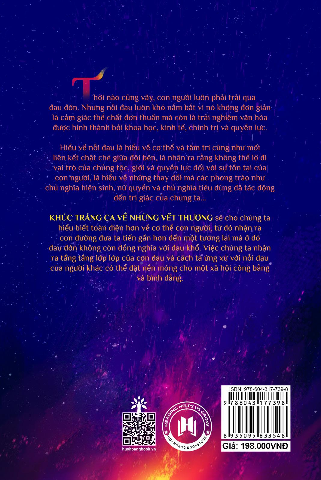 Mua tại TiktokKhúc Tráng Ca Về Những Vết Thương Cuốn sách cho người đọc hiểu biết toàn diện về cơ thể con người, về ảnh hưởng của những cơn đau đến cuộc sống của chúng ta, cách ta nhìn nhận ý nghĩa và chế ngự nó trong suốt chiều dài lịch sử. Từ đó, chúng ta nắm bắt được bản chất của nỗi đau, cũng như mối liên kết chặt chẽ giữa cơ thể và tâm trí, và nhận ra rằng không thể lờ đi vai trò của c.hủng tộc, giới và quyền lực đối với sự tồn tại của con người.