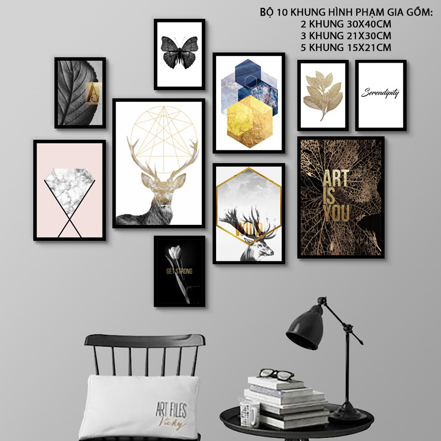Kích Thước Bộ Khung gồm: 2 khung 30x40cm, 3 khung 21x30cm, 5 khung 15x21cm (Tổng kích thước sau khi treo khoảng 90x130cm)
