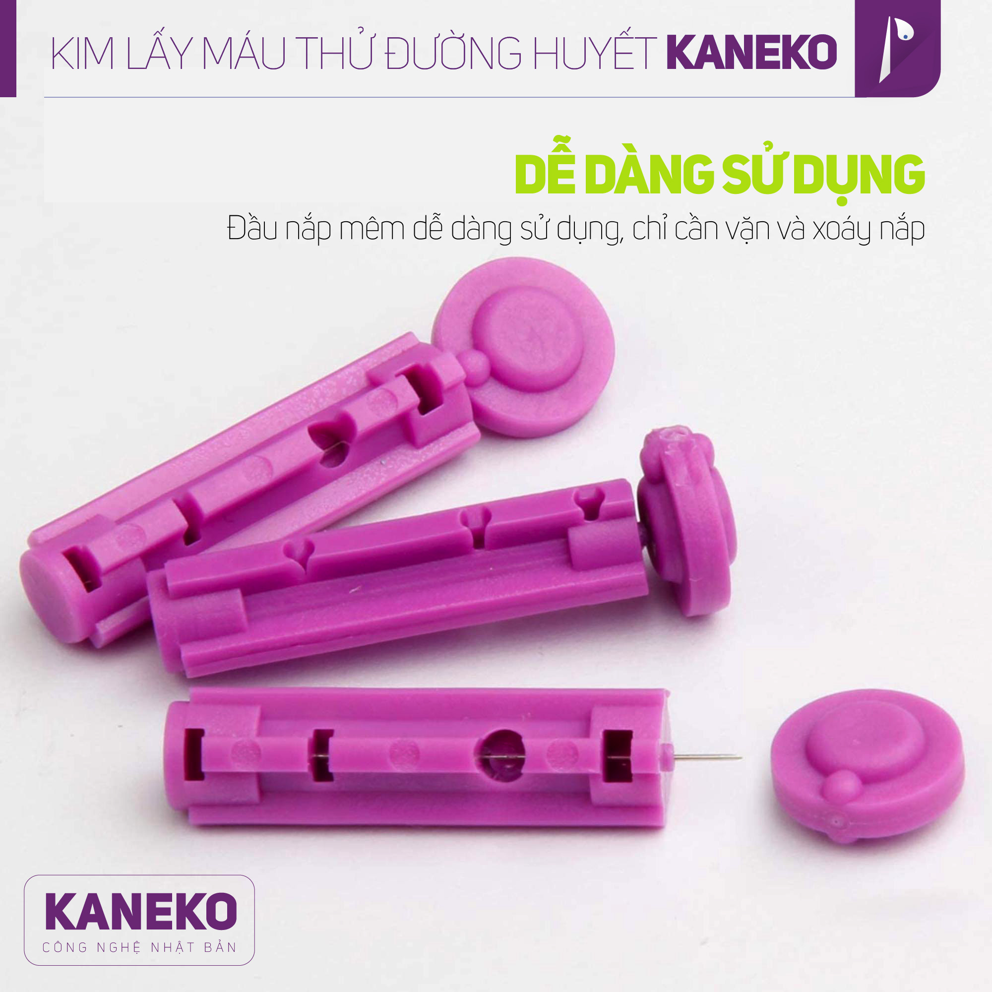 Kim lấy máu thử tiểu đường Kaneko được sản xuất theo công nghệ của Nhật Bản. Sử dụng cho các loại bút của máy thử tiểu đường. Cách dùng: Cắm vào bút và bấm bút