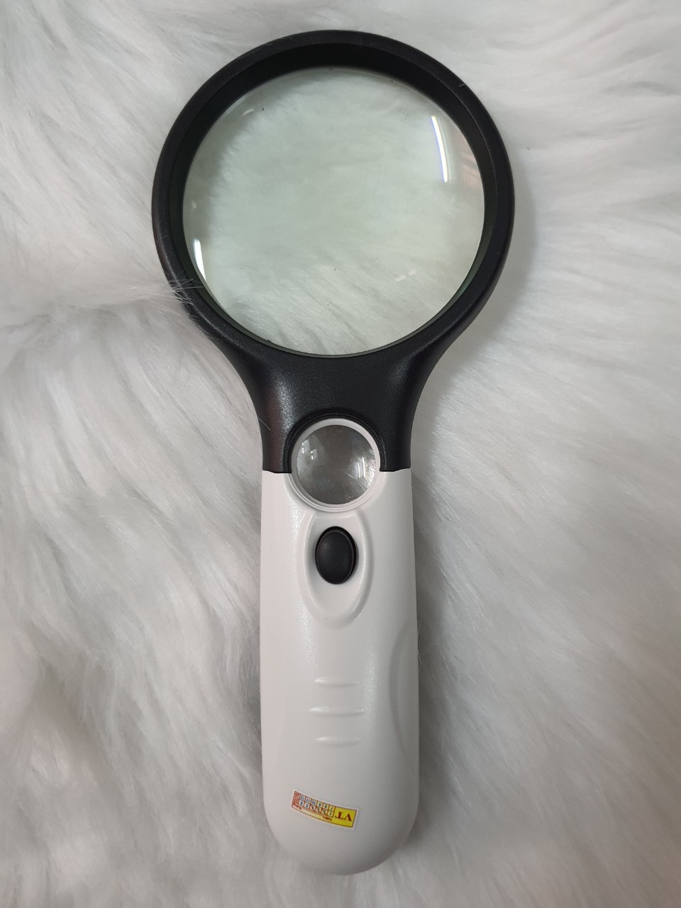 Kính lúp 6902A-B có đèn led được làm bằng thủy tinh quang học cao cấp, bao bọc bởi tay cầm bằng nhựa ABS trắng cứng trơn tru