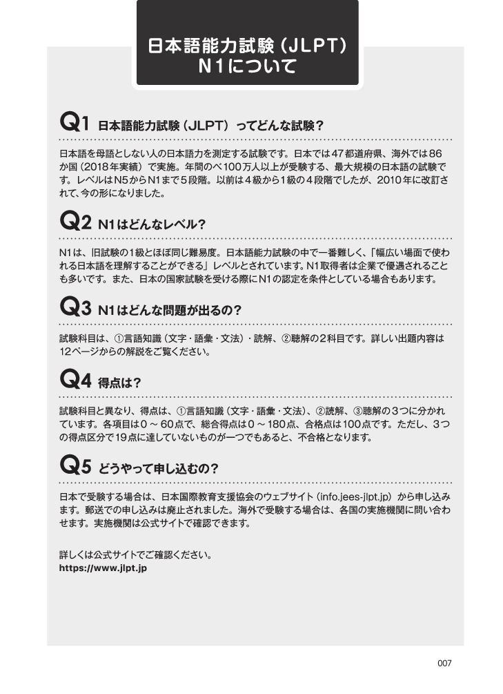 Luyện thi Năng lực Nhật ngữ N1 gồm 5 quyển: Hán tự (Kanji), Từ vựng (Goi), Đọc hiểu (Dokkai), Nghe hiểu (Choukai) và Ngữ pháp (Bunpou). Đây là một tựa sách học tiếng Nhật hàng