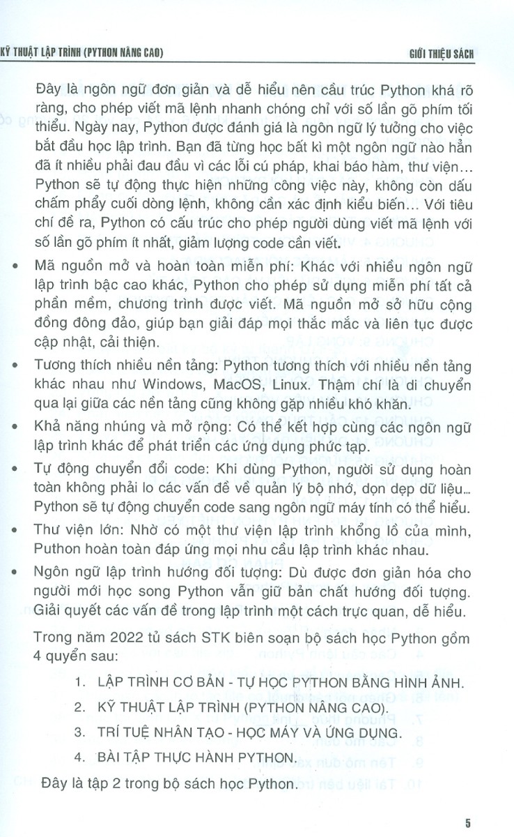 Mua tại TiktokKỹ Thuật Lập Trình Python Nâng Cao Về cuốn sách này Đến bất kỳ hiệu sách lớn nào (trực tiếp hoặc trực tuyến), bạn sẽ tìm thấy rất nhiều sách Python. Nếu đã quen với việc đọc sách bạn sẽ có một cái nhìn tổng quan nhanh chóng giúp bạn quyết định liệu cuốn sách này có thực sự phù hợp với bạn hay không. Cuốn sách này mong muốn phổ cập ngôn ngữ Python đến với nhiều bạn có mong muốn tìm hiểu lập trình máy tính. Sách được viết cho các đối tượng chính sau: Không yêu cầu người học có kinh nghiệm lập trình trước đó. Học sinh phổ thông. Sinh viên chuyên hay không chuyên ngành CNTT. Các bạn mong muốn trở thành lập trình viên Front-end, Back-end,