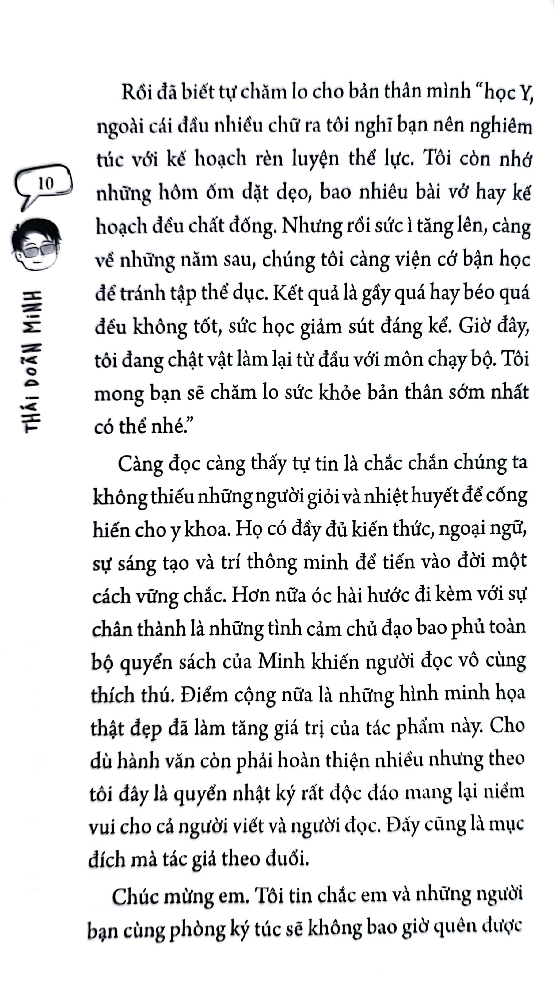 Càng đọc càng thấy tự tin là chắc chắn chúng ta không thiếu những người giỏi và nhiệt huyết để cống hiến cho y khoa. Họ có đầy đủ kiến thức, ngoại ngữ, sự sáng tạo và trí thông minh để tiến vào đời một cách vững chắc. Hơn nữa óc hài hước đi kèm với sự chân thành là những tình cảm chủ đạo bao phủ toàn bộ quyển sách của Minh khiến người đọc vô cùng thích thú. Điểm cộng nữa là những bức tranh minh họa thật đẹp đã làm tăng giá trị của tác phẩm này. Cho dù hành văn còn phải hoàn thiện nhiều nhưng theo tôi đây là quyển nhật ký rất độc đáo mang lại niềm vui cho cả người viết và người đọc. Đấy cũng là mục đích mà tác giả theo đuổi.