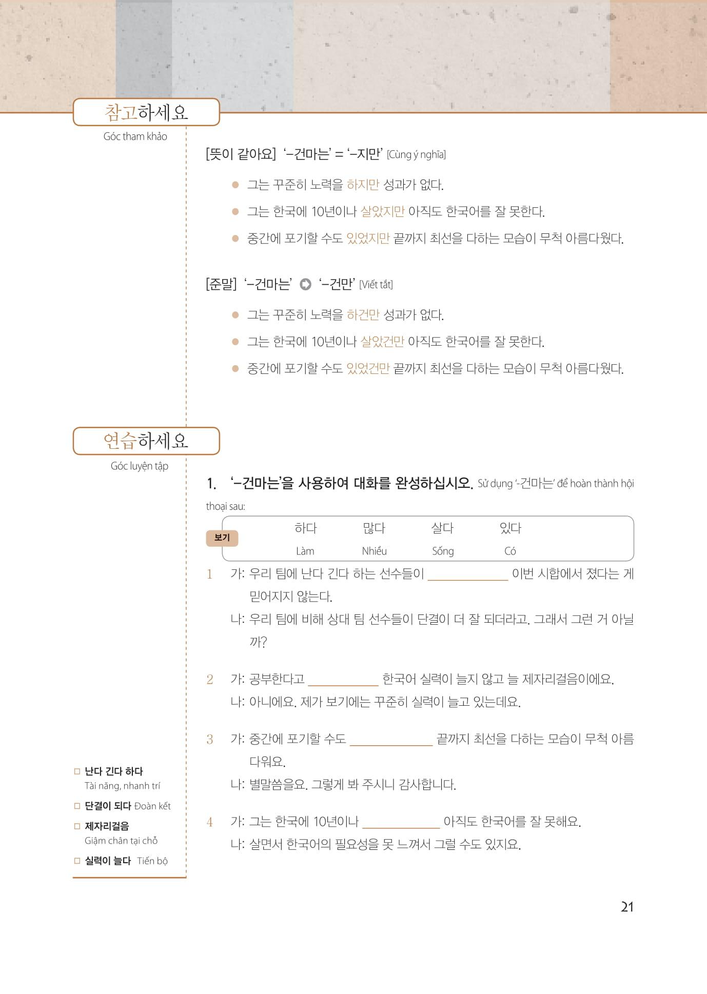 Cung cấp kho từ vựng, ví dụ đa dạng, cũng như các dạng bài tập điển hình giúp người học làm quen chính xác ý nghĩa và cách sử dụng tiếng Hàn