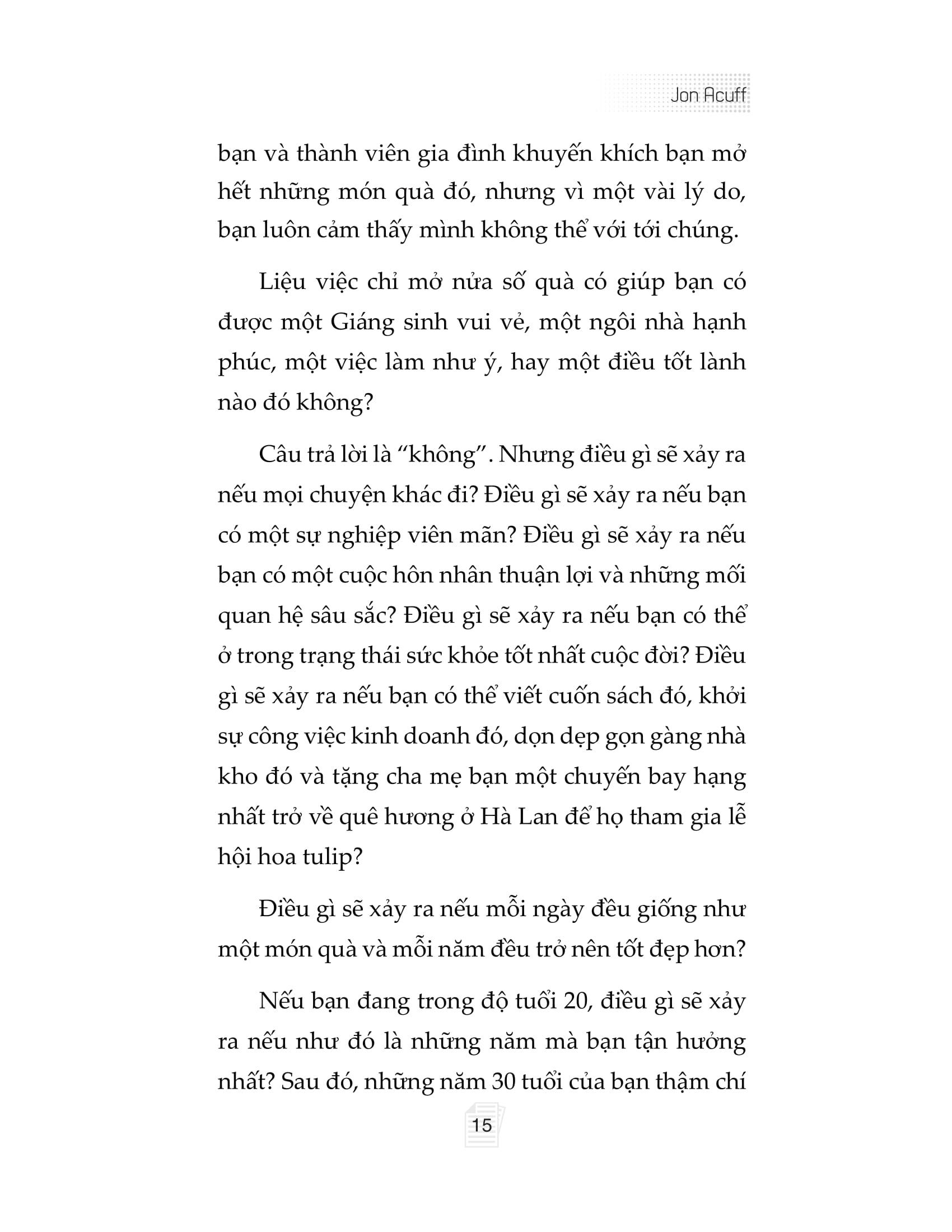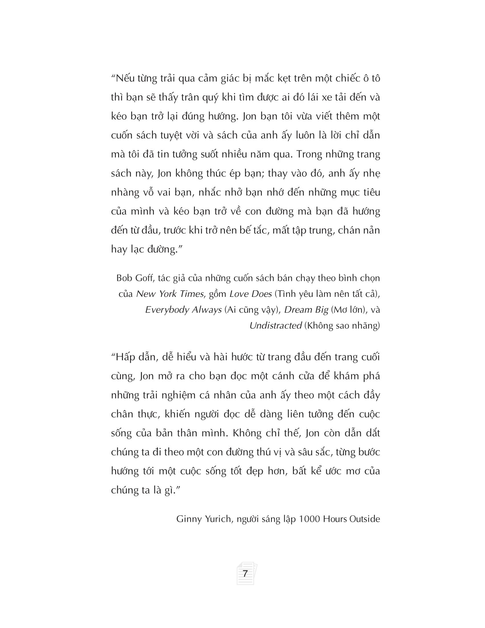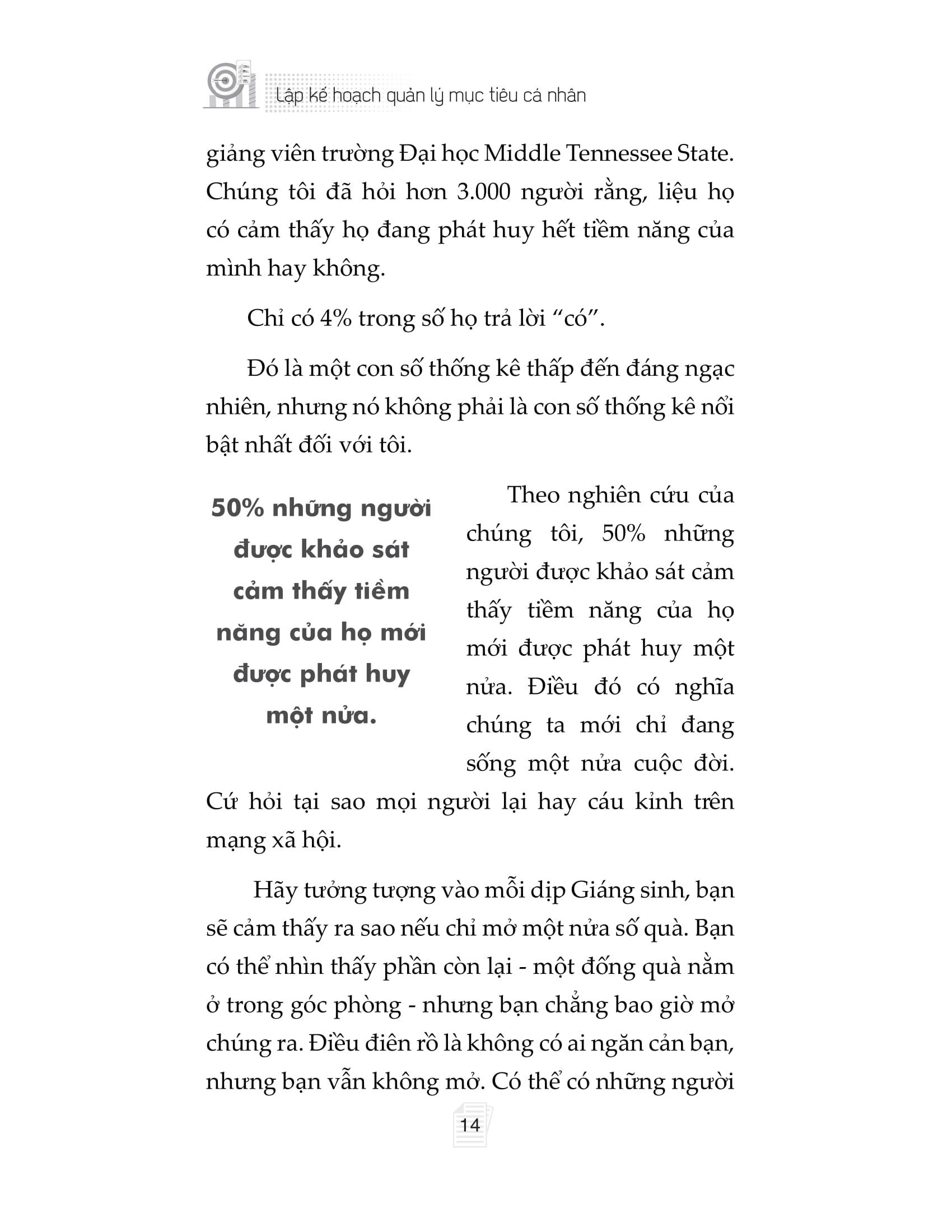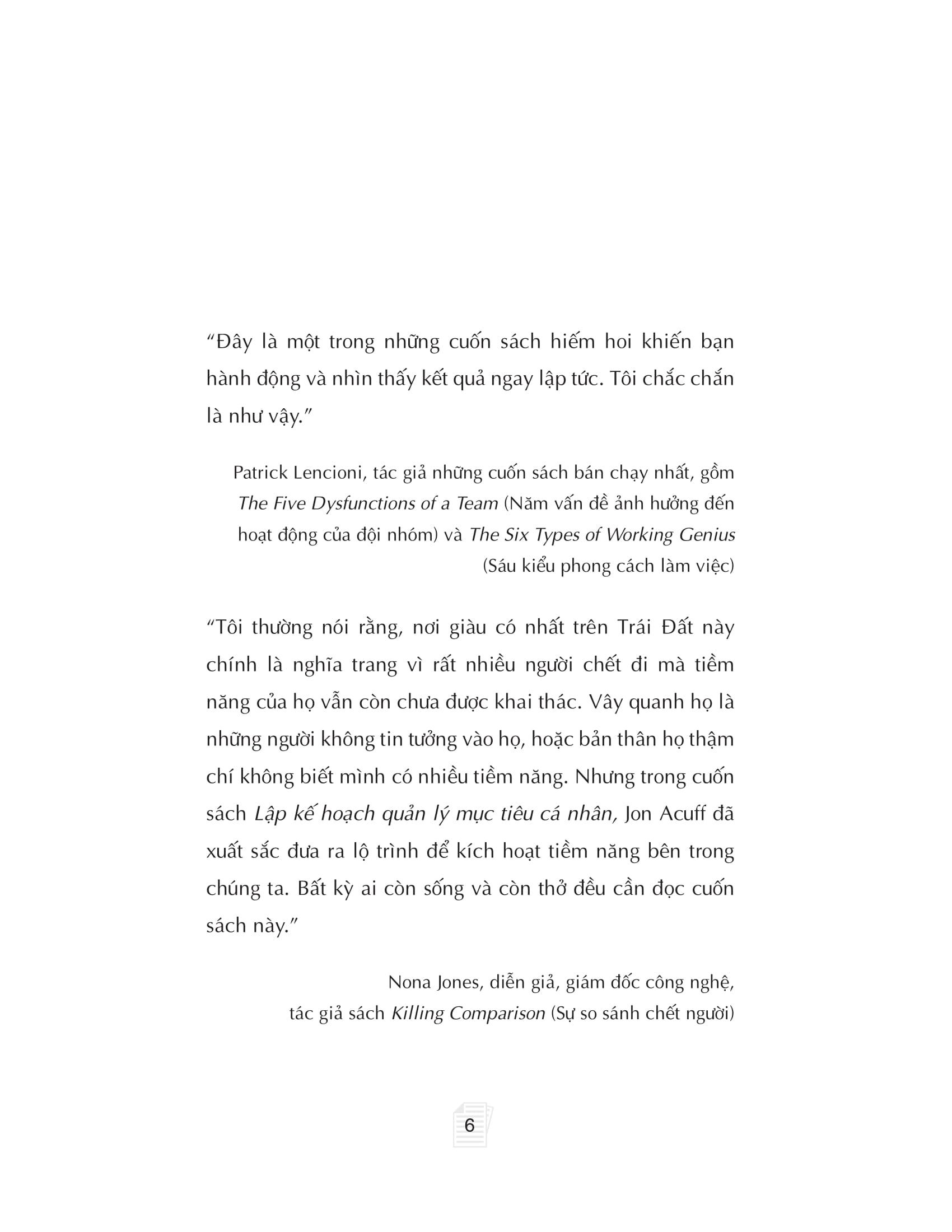 Cuốn sách “Lập kế hoạch quản lý mục tiêu cá nhân” viết ra nhằm hướng dẫn bạn cách thiết lập mục tiêu theo ba cấp độ để khai phá trọn vẹn tiềm năng của chính m.ình trong mọi khía cạnh cuộc sống (sự nghiệp, tài chính, mối quan hệ, sức khỏe và niềm vui). Với việc thiết lập mục tiêu hợp lý và có kế hoạch theo dõi tiến độ rõ ràng, bất kỳ ai áp dụng phương pháp của Jon Acuff cũng có thể duy trì năng lượng và động lực vô tận để vươn tới những mục tiêu to lớn, dài hạn và giàu ý nghĩa.