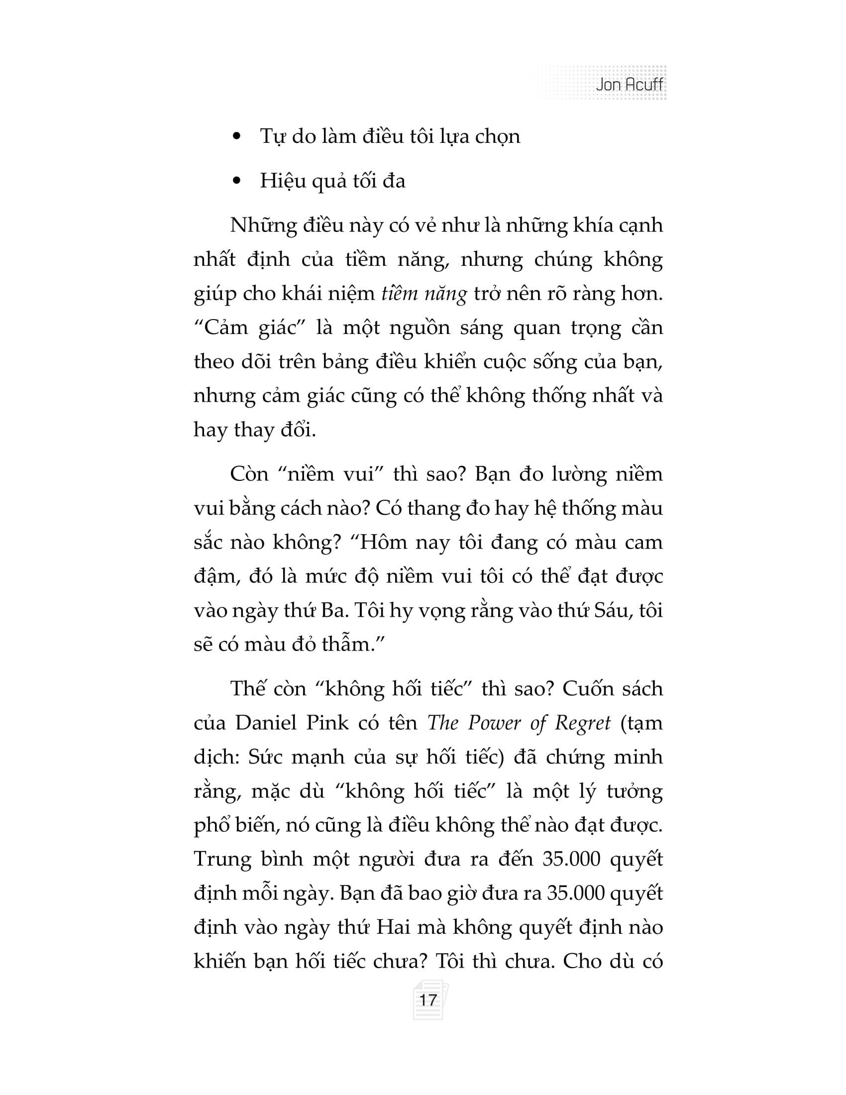 Đặc biệt, bằng việc cung cấp các công cụ dễ áp dụng và hàng chục ví dụ thực tế về những con người thật, những câu chuyện thật, Jon Acuff không chỉ hướng dẫn ta cách bước vào Vùng tiềm năng, mà còn là sống lâu dài ở đó một cách bền bỉ, vui vẻ và đầy hứng khởi.