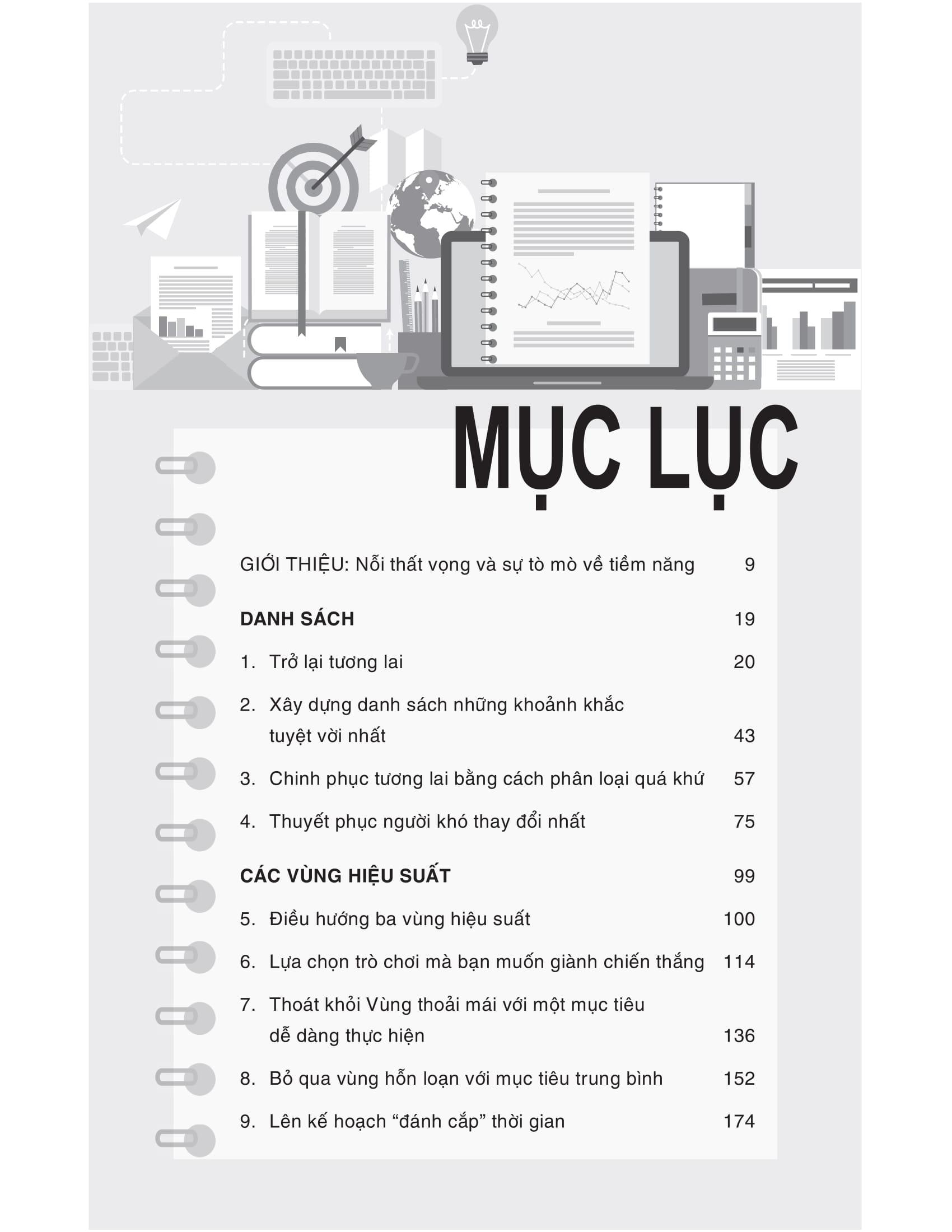 Với ba cấp độ mục tiêu (mục tiêu dễ dàng, mục tiêu trung bình và mục tiêu đảm bảo sẽ đạt được), tác giả vạch ra một con đường rõ ràng để ta kéo bản thân m.ình ra khỏi Vùng thoải mái trì trệ, tránh xa Vùng hỗn loạn luôn căng thẳng, để có thể tận hưởng những khoảnh khắc tuyệt vời trong Vùng tiềm năng.