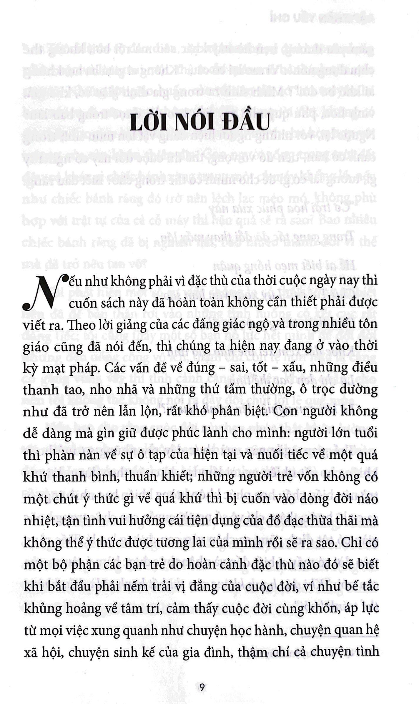 Nếu như không phải vì đặc thù của thời cuộc ngày nay thì cuốn sách này đã hoàn toàn không cần thiết phải được viết ra. Theo lời giảng của các đấng giác ngộ và trong nhiều tôn giáo cũng đã nói đến, thì chúng ta hiện nay đang ở vào thời kỳ mạt pháp. Các vấn đề về đúng – sai, tốt – xấu, những điều thanh tao, nho nhã và những thứ tầm thường, ô trọc dường như đã trở nên lẫn lộn, rất khó phân biệt. Con người không dễ dàng mà gìn giữ được phúc lành cho m.ình: người lớn tuổi thì phàn nàn về sự ô tạp của hiện tại và nuối tiếc về một quá khứ thanh bình, thuần khiết; những người trẻ vốn không có một chút ý thức gì về quá khứ thì bị cuốn vào dòng đời náo nhiệt, tận tình vui hưởng cái tiện dụng của đồ đạc thừa thãi mà không thể ý thức được tương lai của m.ình rồi sẽ ra sao. Chỉ có một bộ phận các bạn trẻ do hoàn cảnh đặc thù nào đó sẽ biết khi bắt đầu phải nếm trải vị đắng của cuộc đời, ví như bế tắc khủng hoảng về tâm trí, cảm thấy cuộc đời cùng khốn, áp lực từ mọi việc xung quanh như chuyện học hành, chuyện quan hệ xã hội, chuyện sinh kế của gia đình, thậm chí cả chuyện tình cảm yêu đương, hẹn hò này khác sao mà rối bời, không thể chịu đựng nổi… Vì sao lại có câu: “Không ai giàu ba họ, không ai khó ba đời”? Mình sinh ra trong gia đình giàu có, khá giả, vinh hoa, phú quý như vậy liệu kéo dài được trong bao lâu? Ngược lại, với những người hiện đang vật lộn mưu sinh trong cảnh cơ hàn, tiền đồ vô vọng, thế thì cuộc đời này có nghĩa lý gì, tương lai có gì để cho m.ình có thể trông chờ? Biết đâu rằng: