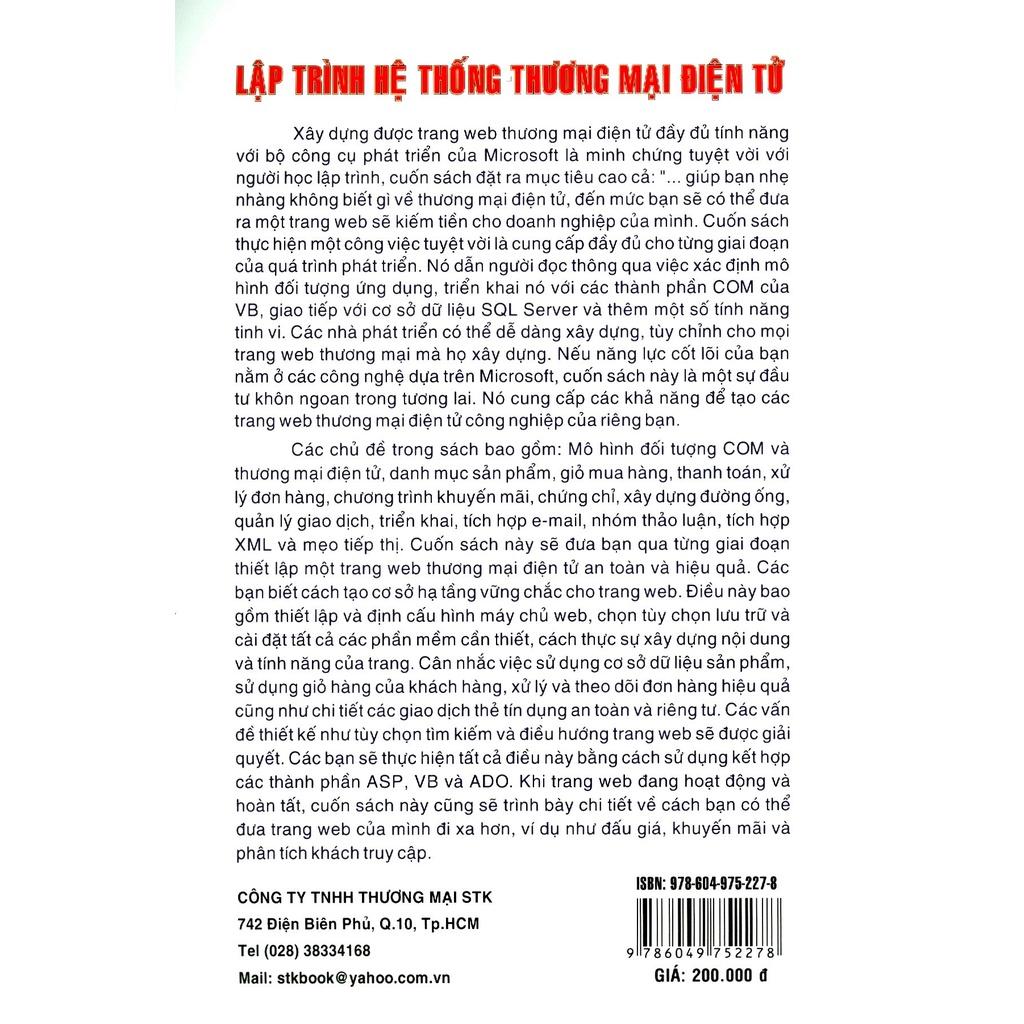 Xây dựng được trang web thương mại điện tử đầy đủ tính năng với bộ công cụ phát triển của Microsoft là minh chứng tuyệt vời với người học lập trình, cuốn sách đặt ra mục tiêu cao cả: " giúp bạn nhẹ nhàng không biết gì về thương mại điện tử, đến mức bạn sẽ có thể đưa ra một trang web sẽ kiếm tiền cho doanh nghiệp của mình. Cuốn sách thực hiện một công việc tuyệt vời là cung cấp đầy đủ cho từng giai đoạn của quá trình phát triển. Nó dẫn người đọc thông qua việc xác định mô hình đối tượng ứng dụng, triển khai nó với các thành phần COM của VB, giao tiếp với cơ sở dữ liệu SQL Server và thêm một số tính năng tinh vi. Các nhà phát triển có thể dễ dàng xây dựng, tùy chỉnh cho mọi trang web thương mại mà họ xây dựng.