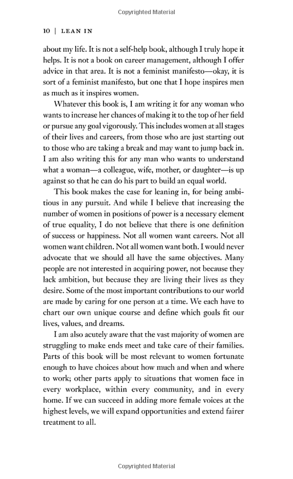 In Lean In, Sandberg digs deeper into these issues, combining personal anecdotes, hard data, and compelling research to cut through the layers of ambiguity and bias surrounding the lives and choices of working women. She recounts her own decisions, mistakes, and daily struggles to make the right choices for herself, her career, and her family. She provides practical advice on negotiation techniques, mentorship, and building a satisfying career, urging women to set boundaries and to abandon the myth of “having it all.” She describes specific steps women can take to combine professional achievement with personal fulfillment and demonstrates how men can benefit by supporting women in the workplace and at home.