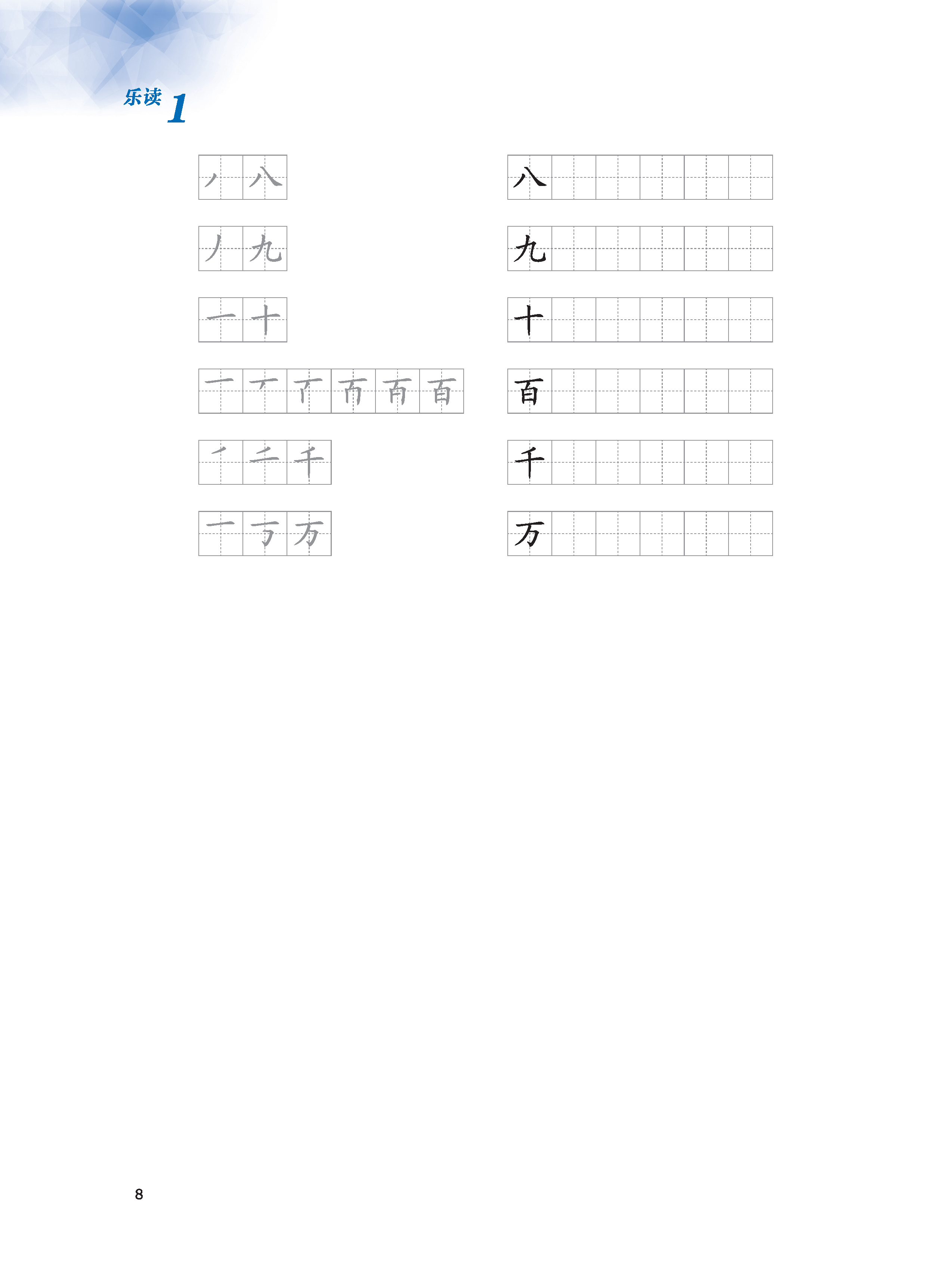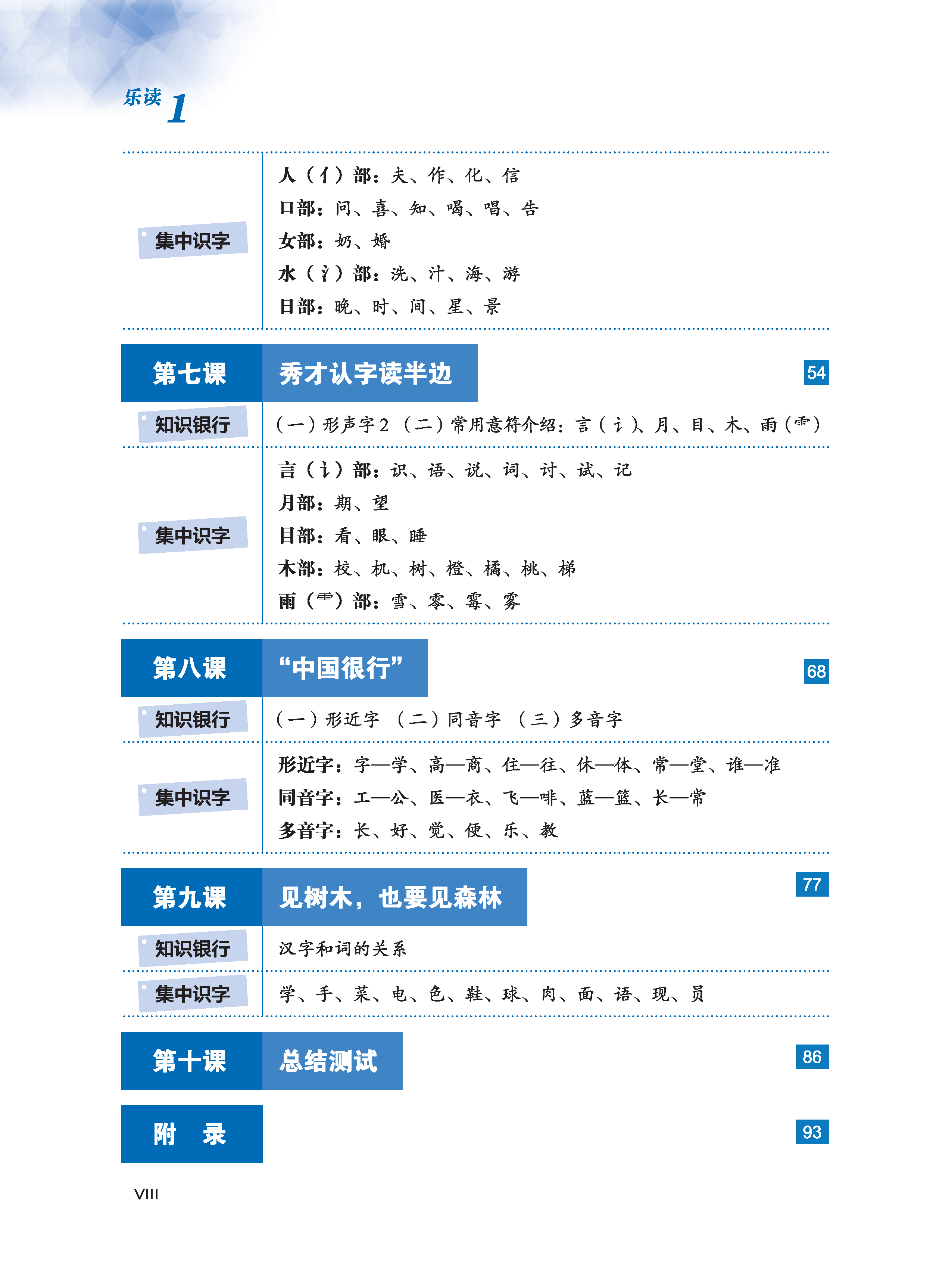 Mảng này giảng giải những tri thức cơ sở về chữ Hán, đồng thời thiết kế phần “Luyện tập” để kiểm tra tình hình lý giải và nắm bắt của học sinh. Phần giảng giải đơn giản, rõ ràng, dễ hiểu, có kèm theo phần dịch tiếng Việt, điều này giúp người học giảm bớt tâm trạng ngại khó khi học chữ Hán, nắm được phương pháp học tập chính xác, nâng cao hứng thú và hiệu suất học tập. Bài 1 và bài 2 chủ yếu giới thiệu về các nét chữ và quy tắc bút thuận của chữ Hán. Bài 3 đến bài 7 giới thiệu về cấu tạo cơ bản của chữ Hán, giảng giải một cách hệ thống về chữ tượng hình, chữ chỉ sự, chữ hội ý và chữ hình thanh; phần chữ hình thanh được chia thành hai bài, một bài chủ yếu giảng giải về ý phù (hình bàng), một bài chủ yếu giảng giải về thanh phù (thanh bàng). Bài 8 giảng giải về ba hiện tượng chữ cận hình, chữ đồng âm và chữ đa âm tồn tại trong tiếng Hán. Bài 9 giới thiệu về mối quan hệ giữa chữ Hán và từ.