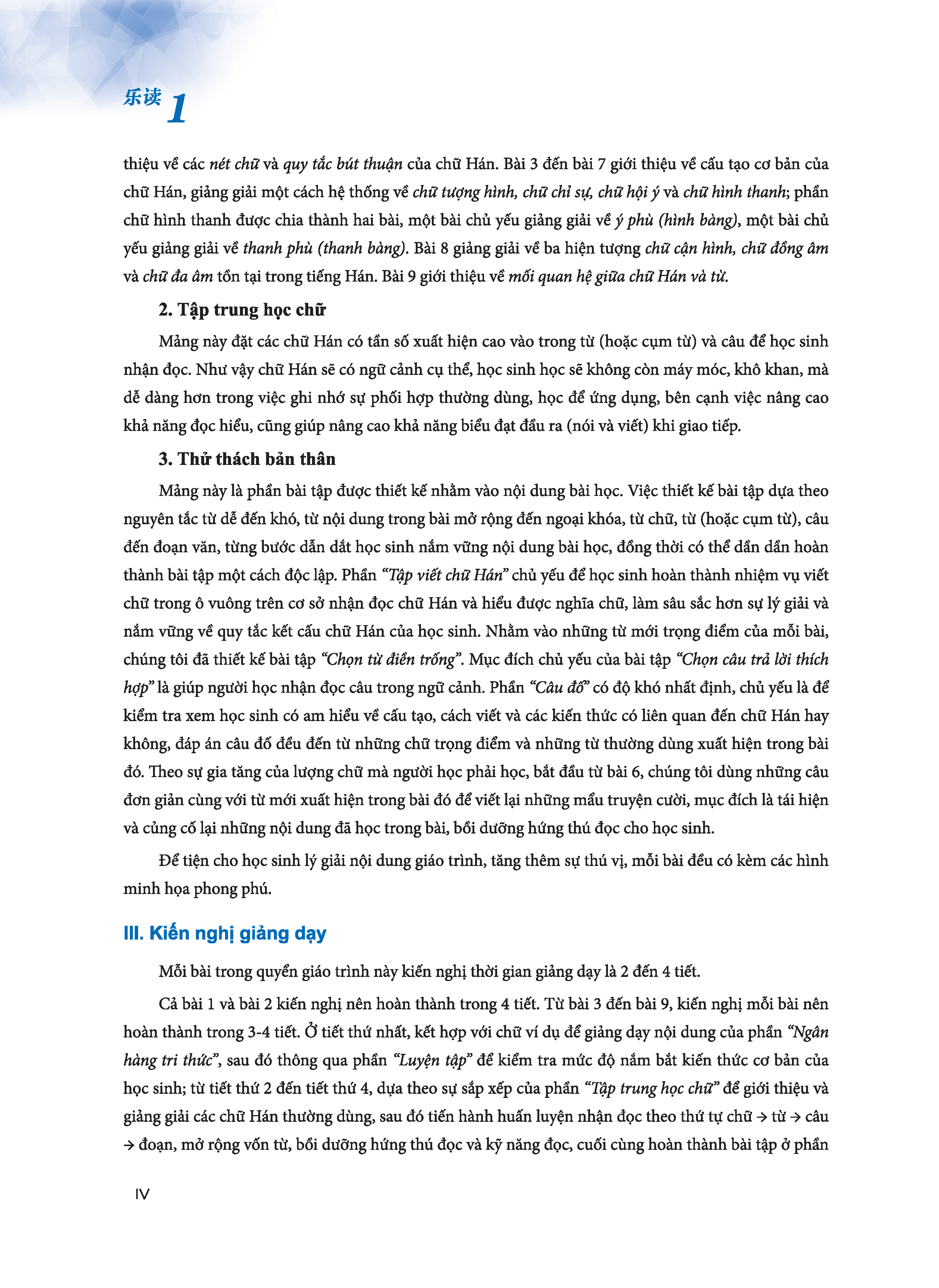 Cả bài 1 và bài 2 kiến nghị nên hoàn thành trong 4 tiết. Từ bài 3 đến bài 9, kiến nghị mỗi bài nên hoàn thành trong 3-4 tiết. Ở tiết thứ nhất, kết hợp với chữ ví dụ để giảng dạy nội dung của phần “Ngân hàng tri thức”, sau đó thông qua phần “Luyện tập” để kiểm tra mức độ nắm bắt kiến thức cơ bản của học sinh; từ tiết thứ 2 đến tiết thứ 4, dựa theo sự sắp xếp của phần “Tập trung học chữ” để giới thiệu và giảng giải các chữ Hán thường dùng, sau đó tiến hành huấn luyện nhận đọc theo thứ tự chữ → từ → câu → đoạn, mở rộng vốn từ, bồi dưỡng hứng thú đọc và kỹ năng đọc, cuối cùng hoàn thành bài tập ở phần “Thử thách bản thân”. Mục đích môn đọc hiểu không phải là viết, nhưng đối với những học sinh mới bắt đầu tiếp xúc với tiếng Trung thì việc vừa viết vừa nhận mặt chữ có thể giúp học sinh ghi nhớ chữ Hán hiệu quả hơn, thầy cô có thể tùy theo tình hình của học sinh mà xem xét việc cho thêm phần viết các chữ Hán cơ bản. Phần “Kiểm tra tổng kết” thầy cô có thể cho học sinh hoàn thành trên lớp, cũng có thể dùng làm đề kiểm tra giai đoạn, có thể hoàn thành trong 2 tiết.