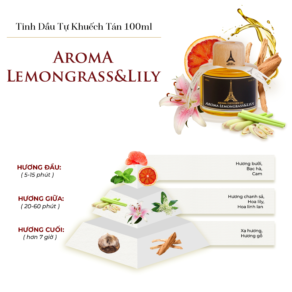 Tinh dầu lọ thơm phòng Lemongrass &Lily mang trong mình hương tươi mát từ chanh sả, hoa lily. Kết hợp với hương bưởi, bạc hà, xạ hương và hương gỗ tạo nên một cảm giác thanh sạch vô cùng.